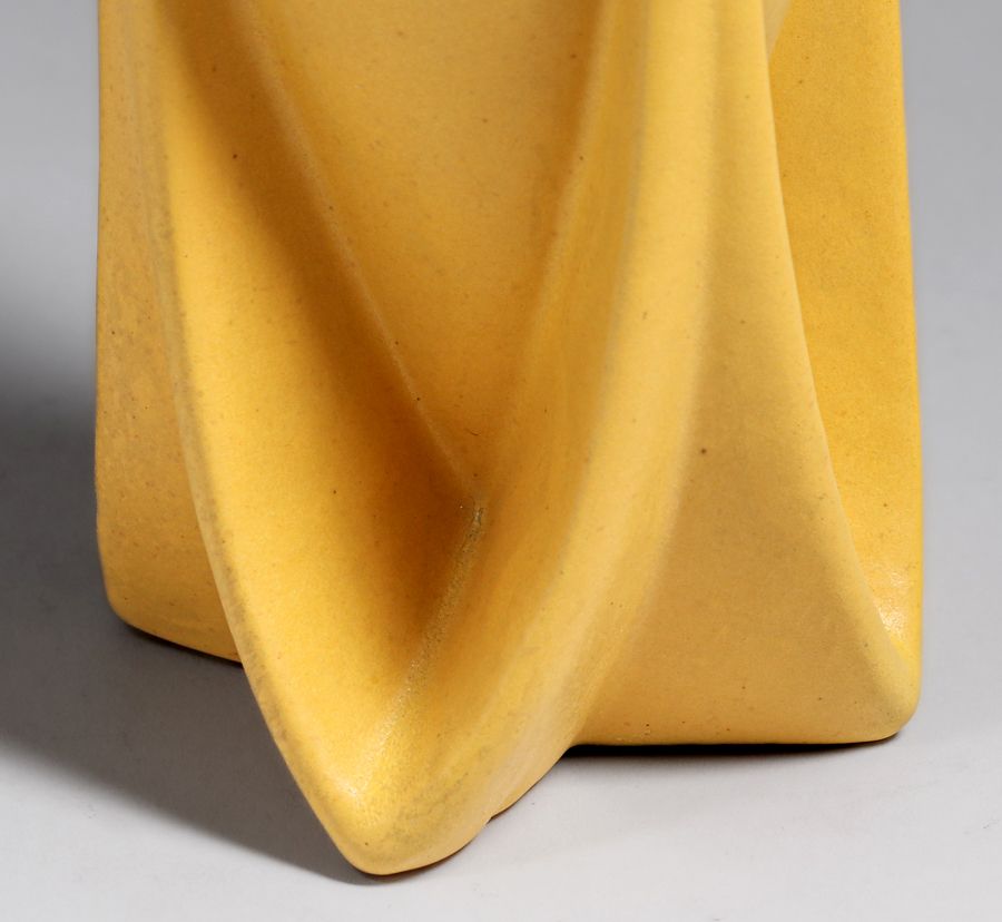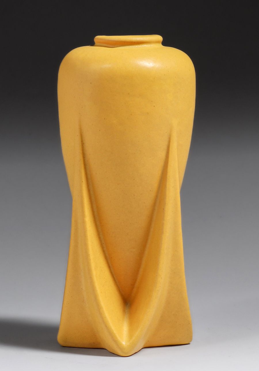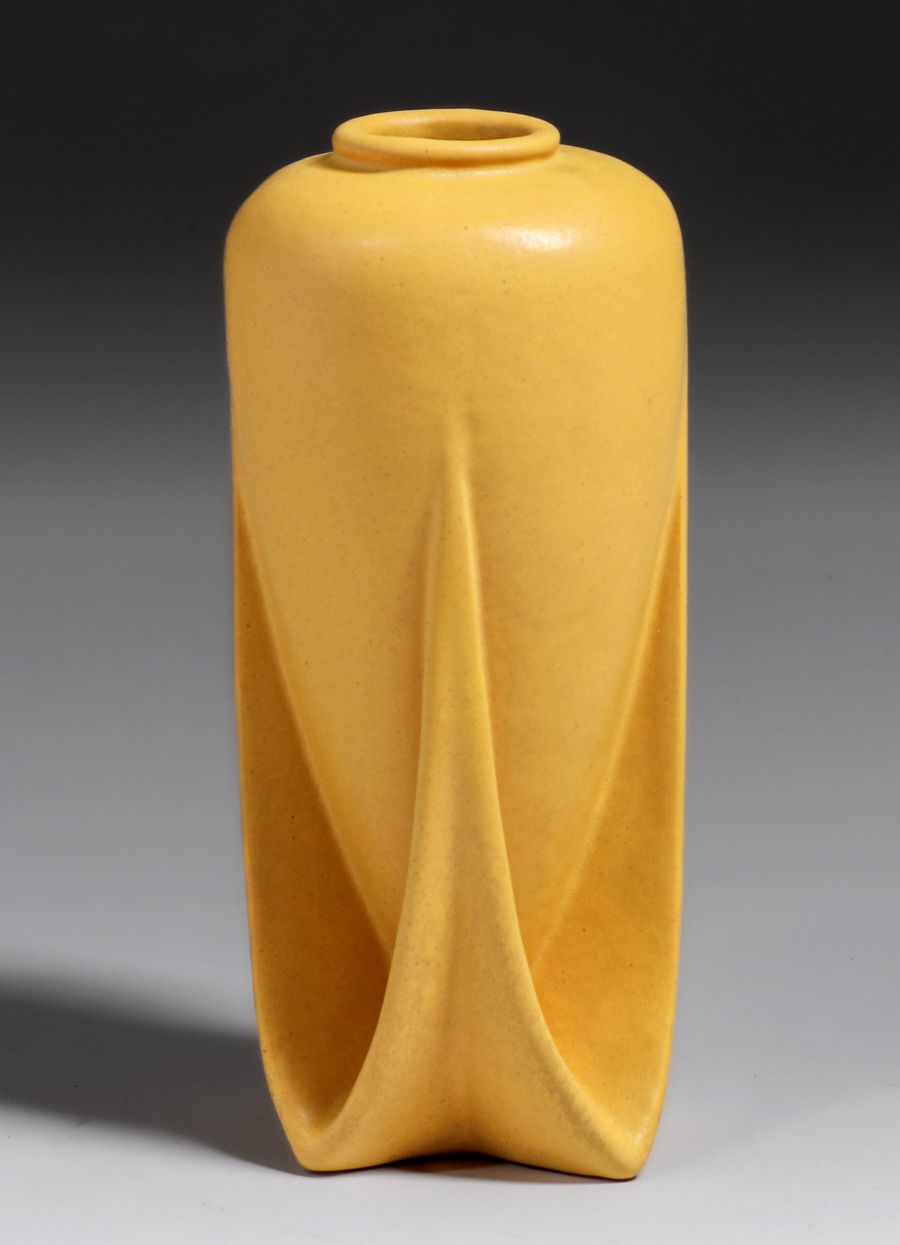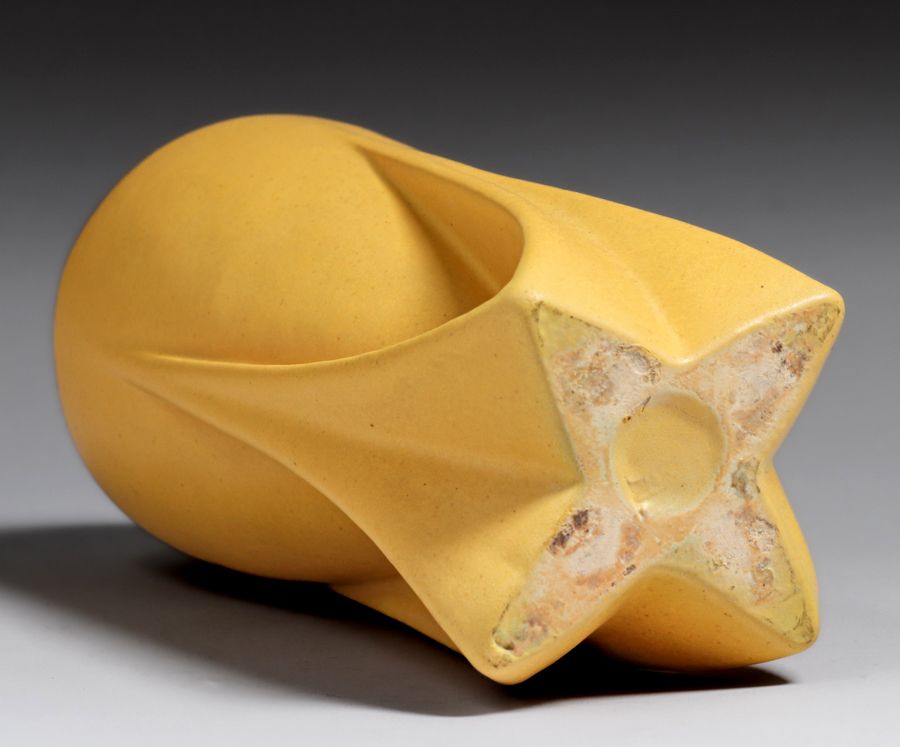 Teco Pottery #127 Matte Yellow Rocket Vase c1910. This highly desirable Teco form almost never surfaces in any color but green. Signed. Invisible professional restoration to small edge chip, otherwise perfect condition. 8 5/8″h x 4″d SOLD