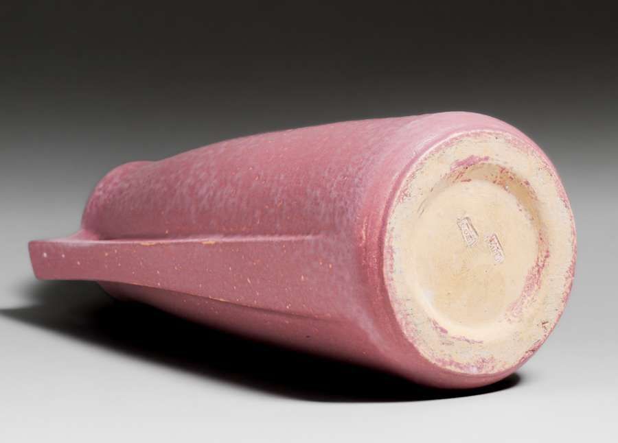 Teco Pottery #266 Two-Handle Vase c1910. Signed twice. Interesting organic texture to unusual matte rose glaze. Invisible professional restoration to small edge chip, otherwise perfect condition. 11.75"h x 4.5"d SOLD