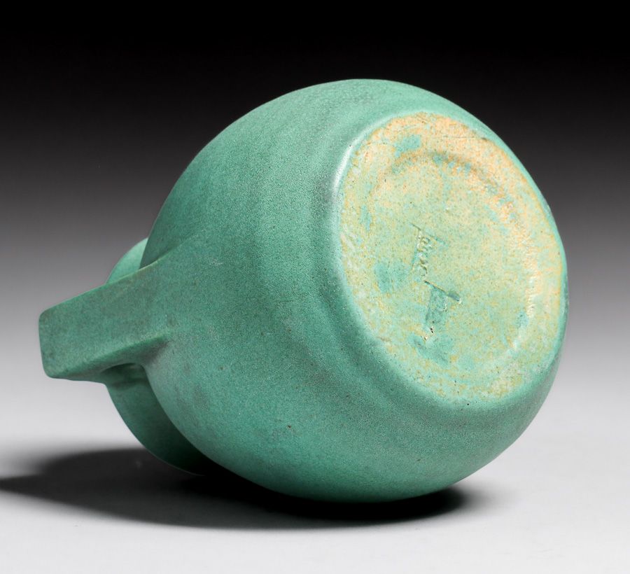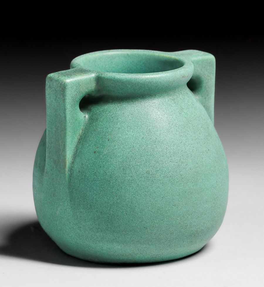 Teco Pottery #426 Matte Green Two-Handled Vase c1910. Signed. Invisible professional restoration to small edge chip to handle, otherwise perfect condition. 3.75”h x 4”d SOLD