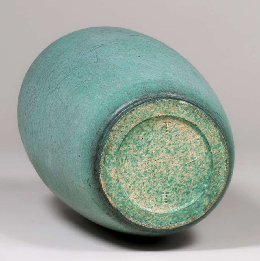 Teco Pottery Matte Green 27"h Garden Vase c1910. Signed. Invisible professional restoration to base chips, otherwise perfect condition. 27"h x 12"d SOLD