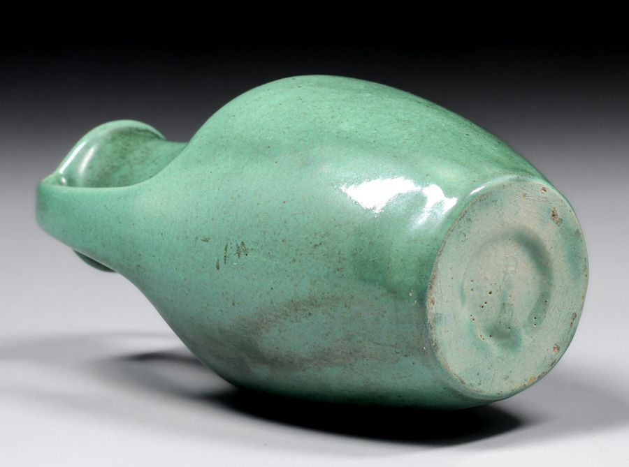 Teco Pottery Semi-Matte Green Two-Handled Vase c1910. Signed. Invisible professional restoration to small rim chip, otherwise perfect condition. 9"h x 5"d SOLD