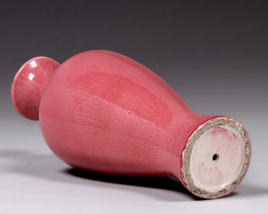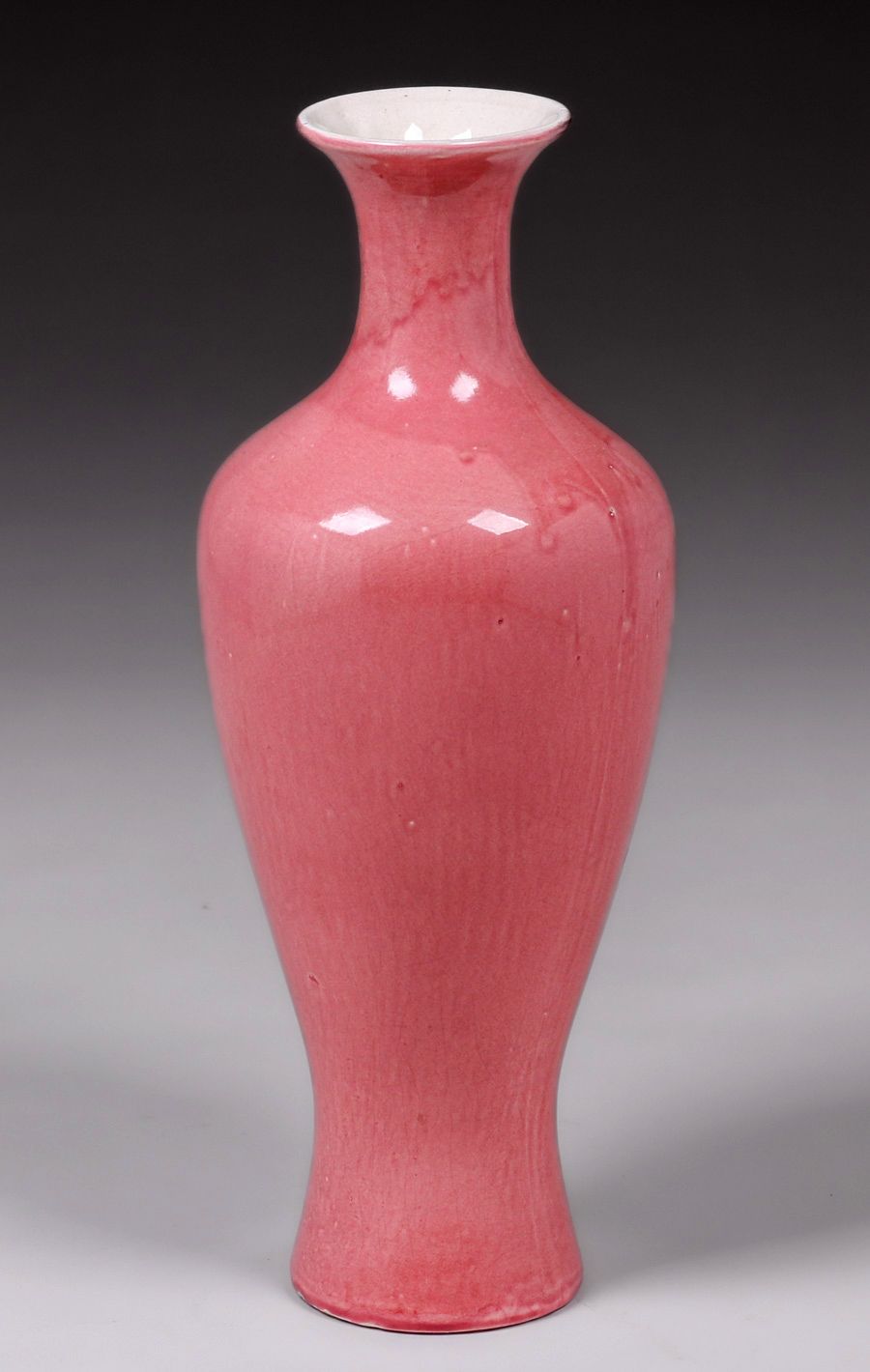 Tall Thomas Gotham – West Coast Porcelain Strawberry Crackleware Floor Vase c1920s. Unsigned. Post-production drill for a lamp base. Several minor glaze imperfections (glaze bubbles). From the Collection of Kirby Brown, author of the California Faience Book. 22.75″h x 8.25″d SOLD