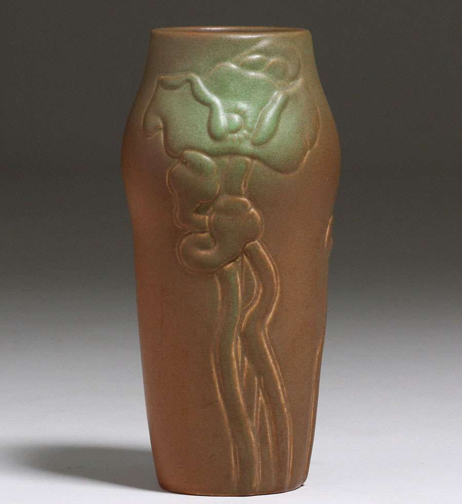 Early Van Briggle 1902 Poppies Vase. Invisible professional restoration to base, small tight hairline to rim otherwise perfect condition. 7.75"h x 4"d SOLD