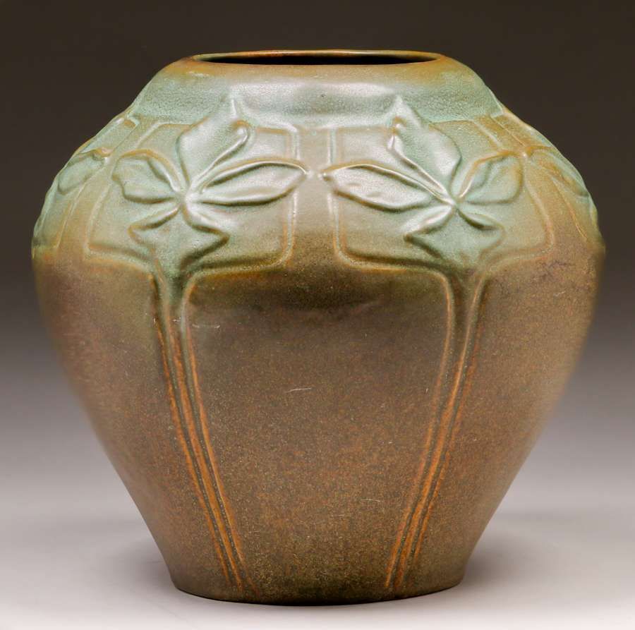 Large Van Briggle Bulbous Vase 1910. Signed. Invisible professional restoration to glaze flakes on base, otherwise perfect condition. 10.5"h x 11"d SOLD