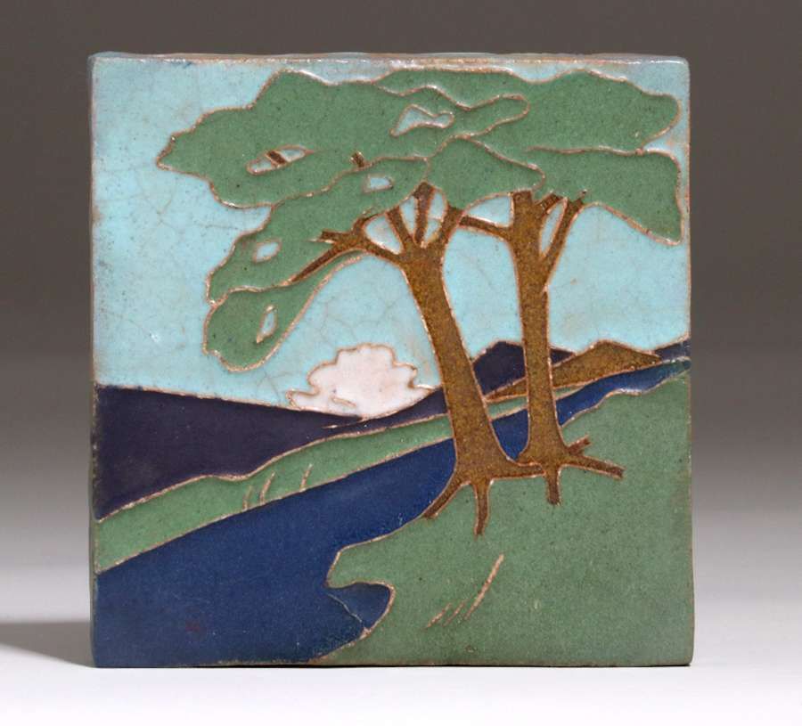 Van Briggle Scenic Pine Tree Tile with multicolor mountain landscape. Unsigned. Invisible professional restoration to small corner chips, otherwise perfect condition. 6″ x 6″ SOLD