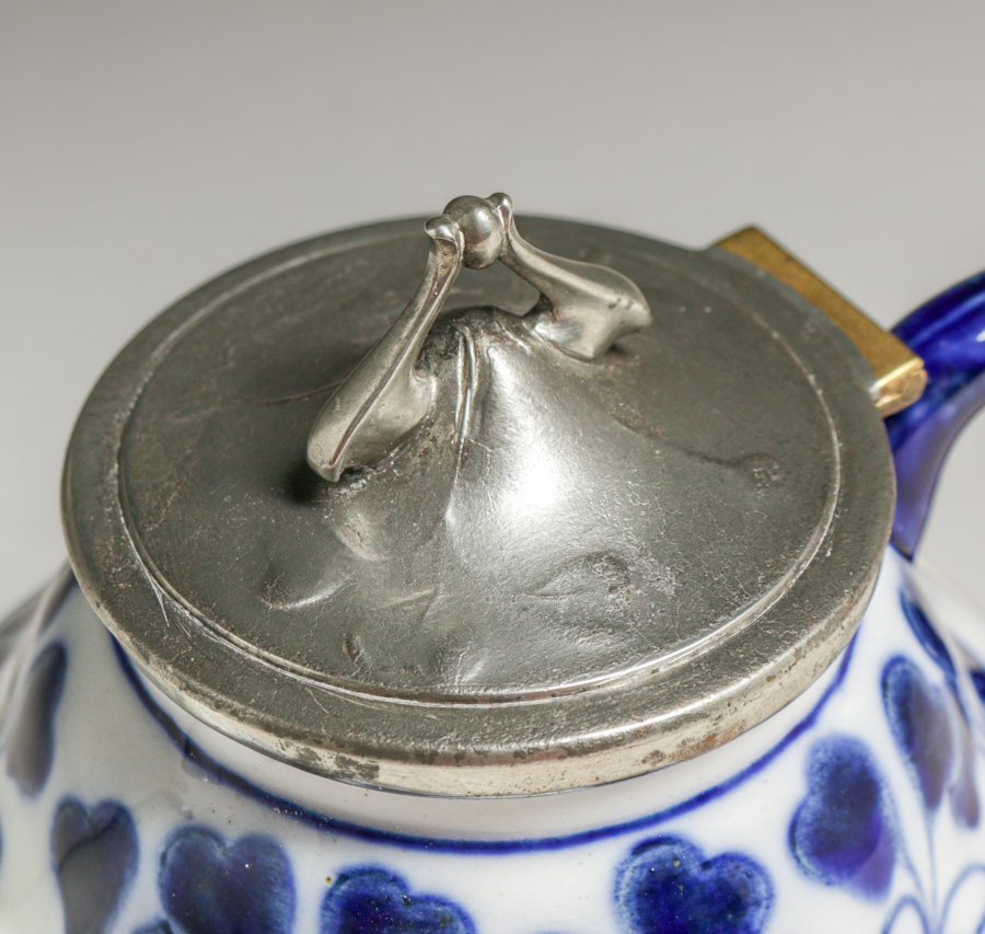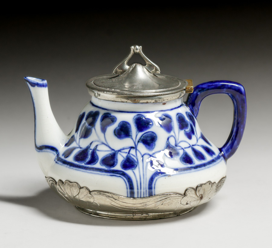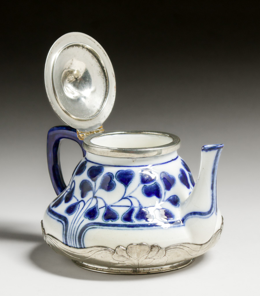 21736. Villeroy & Boch – Orivit Pewter Art Nouveau Overlay Pitcher c1900s.  Unsigned.  Some oxidation to pewter.  Porcelain teapot in perfect condition.  5″h x 6 3/8″w $550