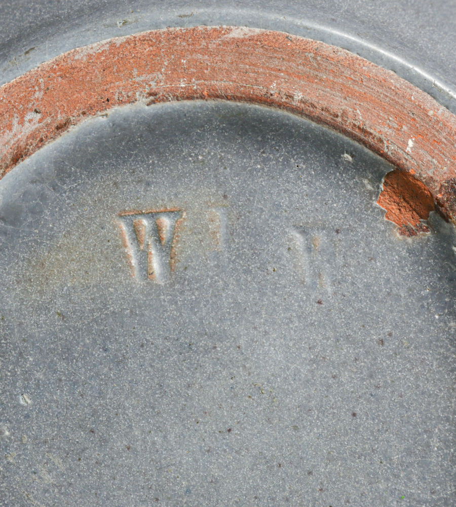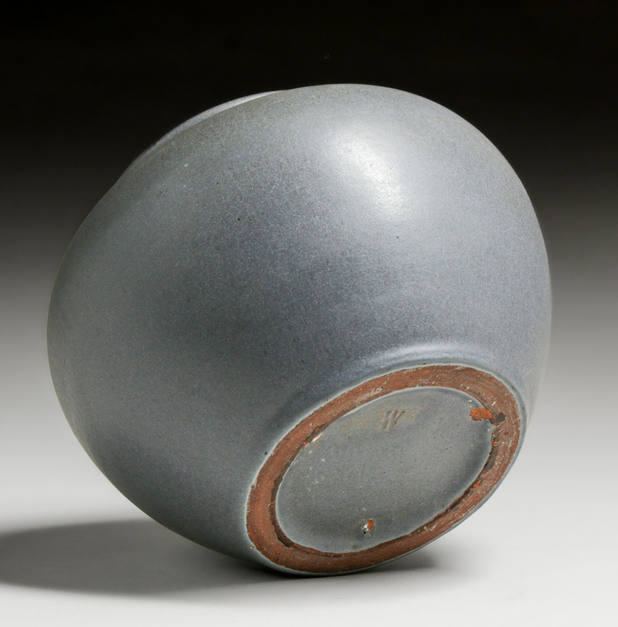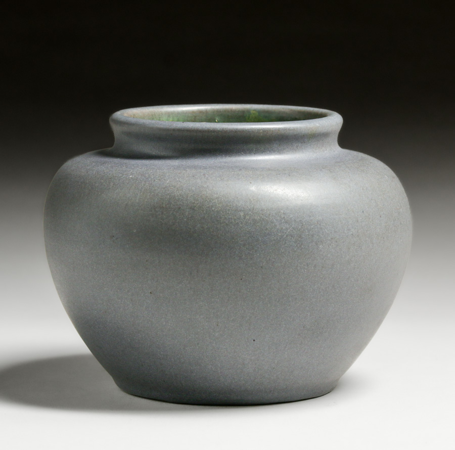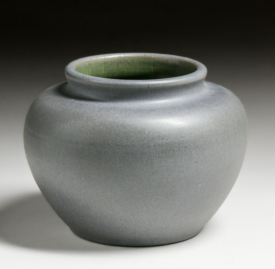 21762. W.J. Walley Pottery Matte Purple & Green Vase c1910. Signed. Stilt pull to bottom. Perfect condition. 5″h x 6.25″d $950