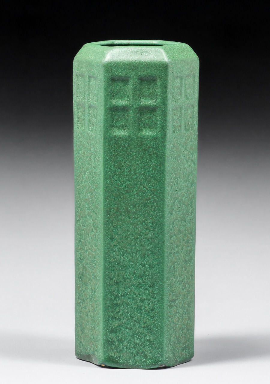 Weller Bedford Matte Green Hexagonal Vase c1910. Unsigned. Invisible professional restoration to tight hairline, otherwise perfect condition. 8.25"h x 3"d SOLD
