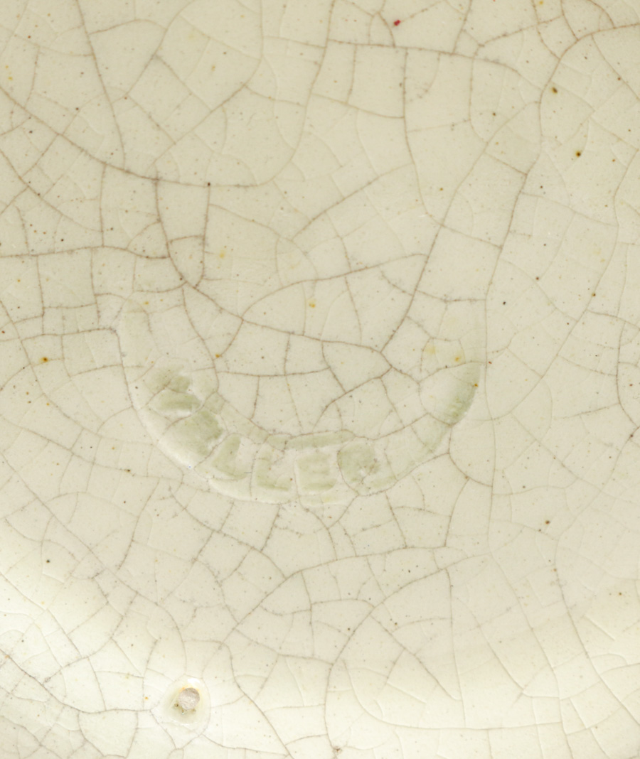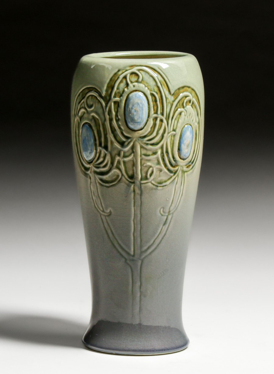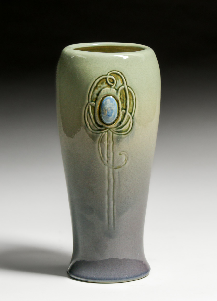 21740. Weller Jewel Pottery Art Nouveau Vase c1910. Signed. Invisible professional restoration to tight hairline, otherwise perfect condition. 10″h x 4.25″d $1200
