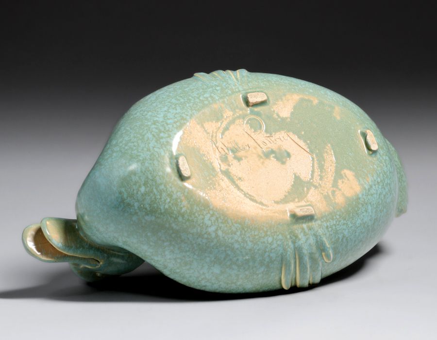 Weller Pottery Duck Shaped Bowl c1920s. Signed. Invisible professional restoration to small rim chip, otherwise perfect condition. 16 x 8.5w x 7.5h inches SOLD