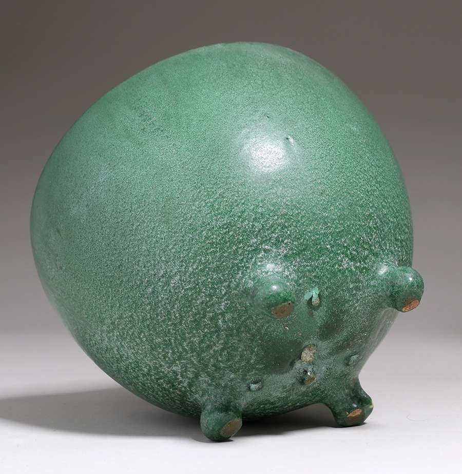 Weller Pottery matte green jardiniere with four feet c1910. Unsigned. Stilt pull irregularities on bottom, otherwise perfect condition. 7.5"h x 9"d SOLD