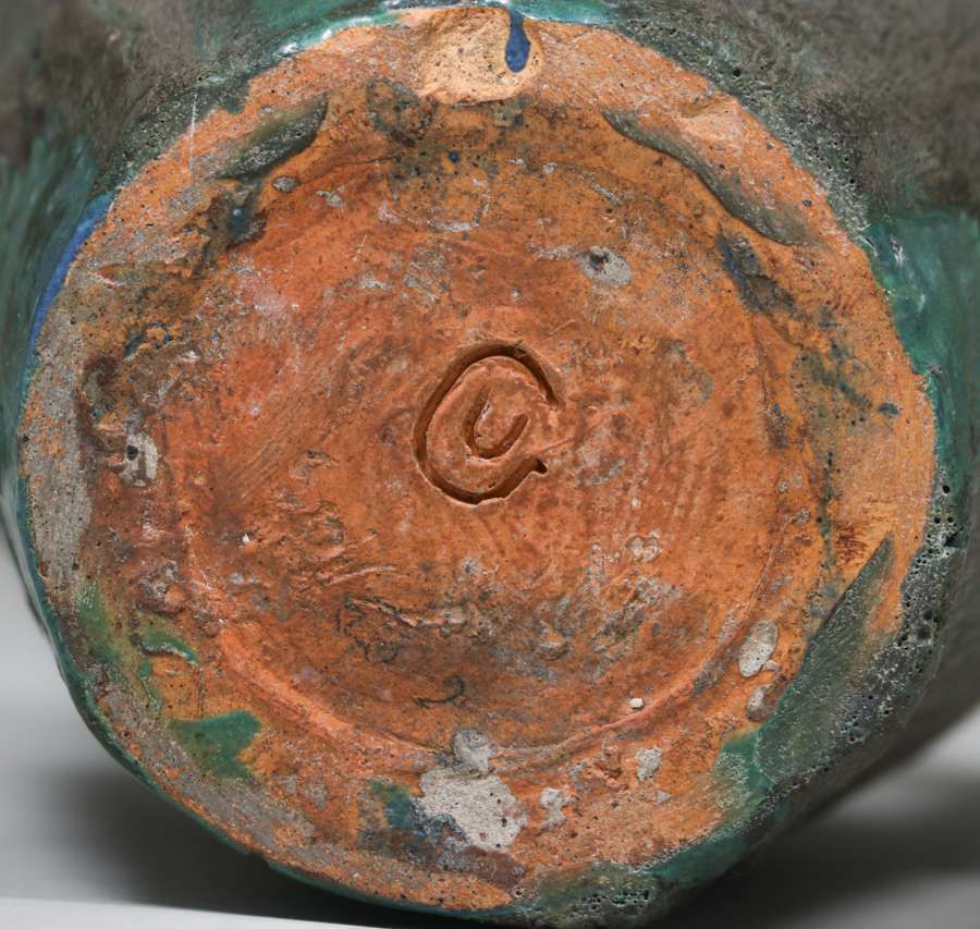 Arts & Crafts Two-Handled Studio Vase c1910. Impressed "UC". Although not stylistically anything like University City Pottery, it does resemble ZARK Pottery which was also located in St Louis. Partially glazed base chip, otherwise perfect condition. 8.75"h x 6"w SOLD