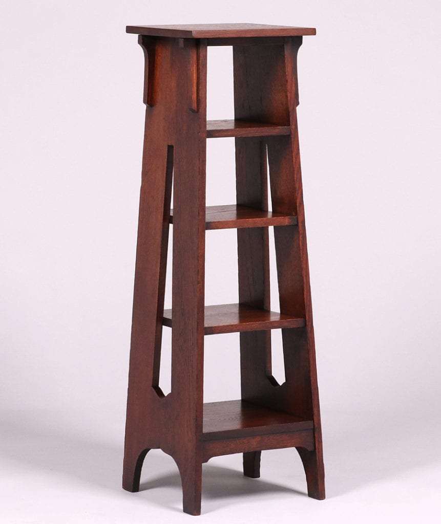 Brooks Furniture Co tall, cutout magazine stand c1910. Unsigned. Top refinished perfectly to match original finish. 44″h x 13″ x 13″ top (14″ x 14″ at base) SOLD