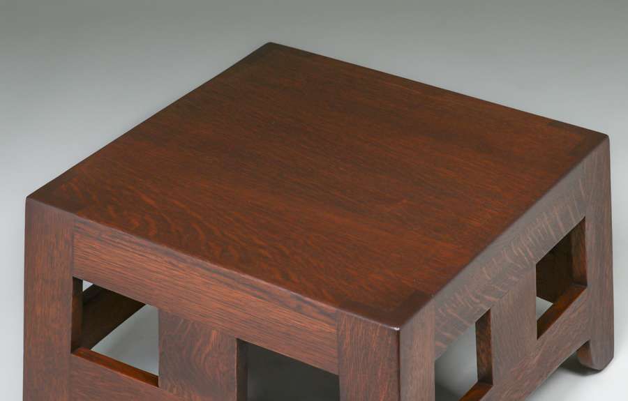 Brooks Furniture Co Cutout Pagoda Base c1910. Originally a taller table. It still makes a very cool pedestal. Unsigned. Very nicely refinished. 19.75"sq x 12.5"h SOLD