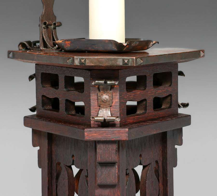- Charles Rohlfs Hand-Carved Oak & Hammered Copper Tall Pedestal Candle Stand 1906