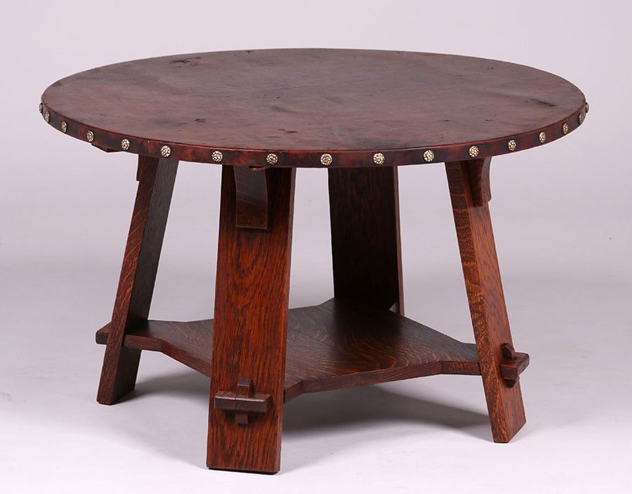 Grand Rapids leather-top coffee table c1905. Unsigned. Old refinish looks like original finish. Original leather top. Probably a taller table originally. 28"d x 17.25"h SOLD