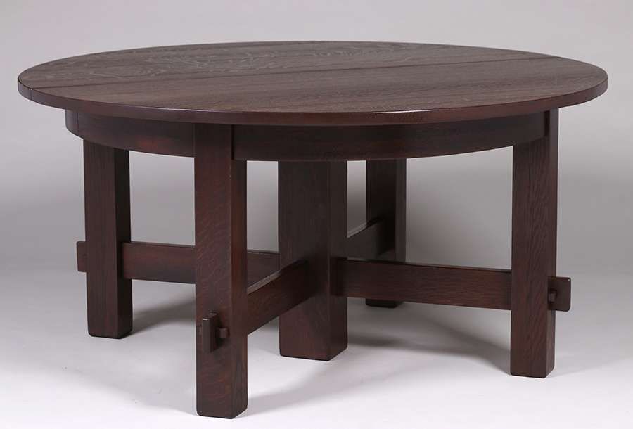 Early Gustav Stickley 60" five-leg dining table c1902 with seven 11.5"w skirted leaves. Four original leaves + three new leaves. Unsigned. Very nicely refinished. 60"d x 29.75"h (extends to 60" x 140.5") SOLD