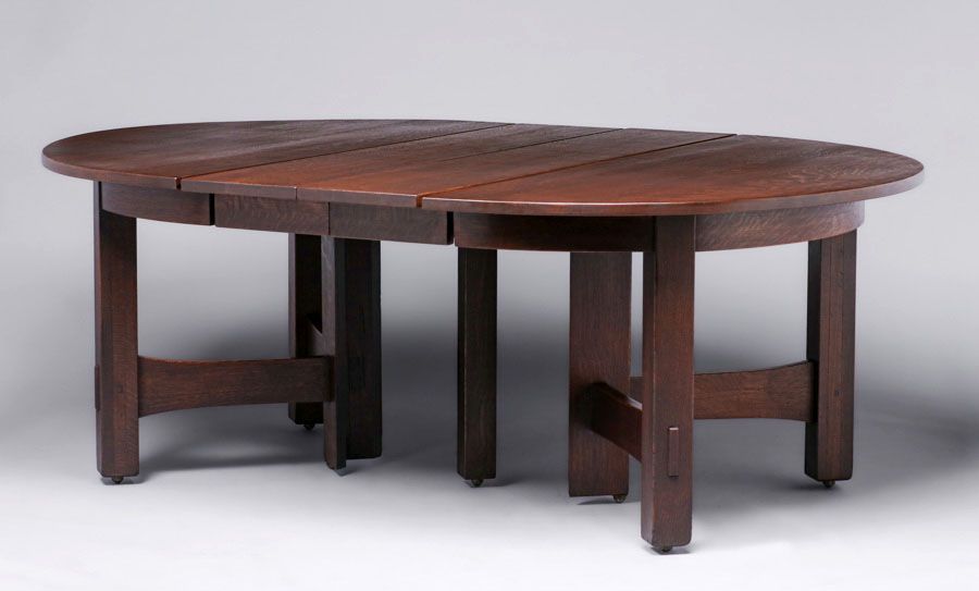 Early Gustav Stickley 60"d Dining Table c1902-1904. A great early example of this classic Gustav Stickley Table. Signed with early decal. Five new 12"w skirted leaves. Top refinished to match excellent original finish on base. 60"d x 30.5"h (120" x 60" with leaves) SOLD