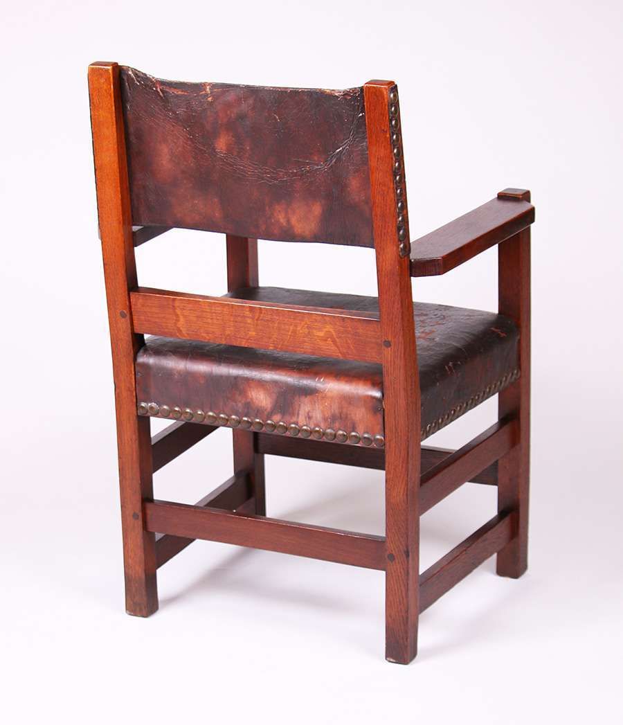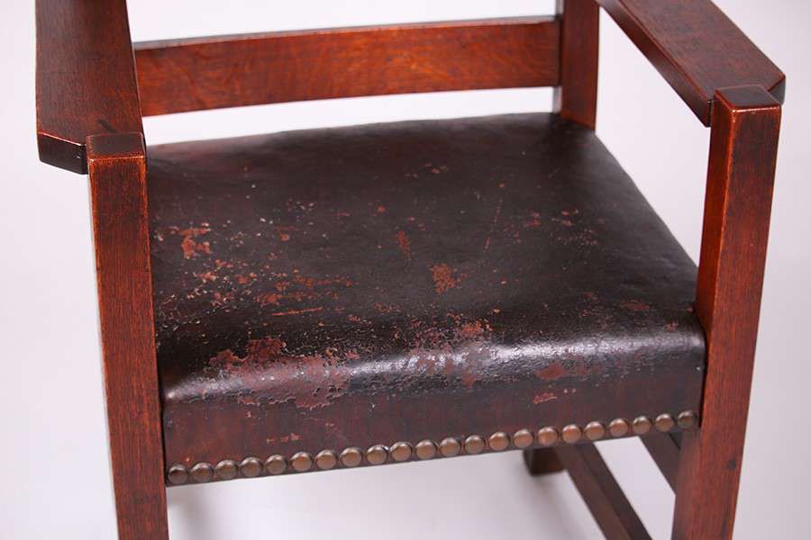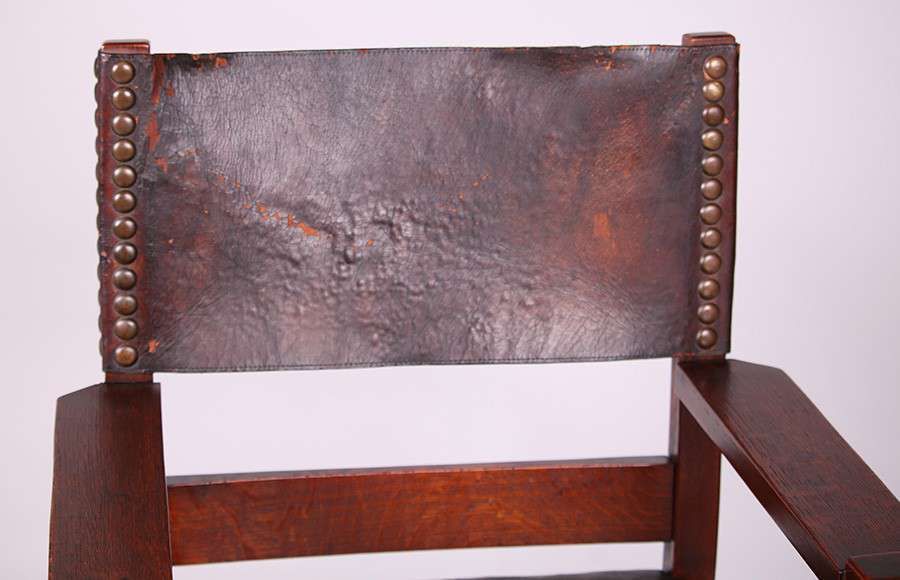 Early Gustav Stickley Armchair #2639 with Original Leather Back and Seat. Excellent original finish. Signed with large early red decal c1901-1902. 36.5"h x 26"w x 20"d SOLD