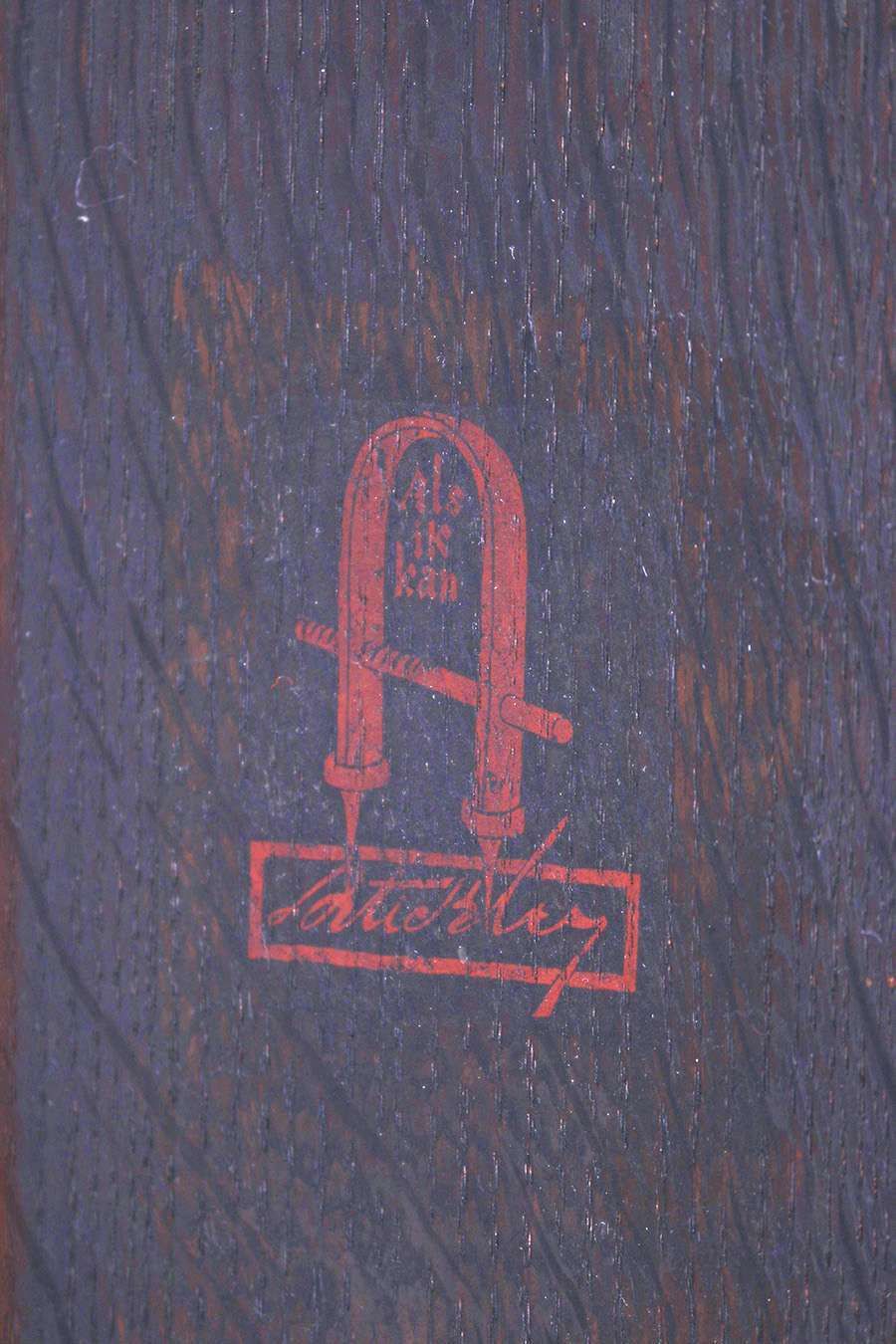 Early Gustav Stickley trestle table. Signed with large early red decal. Extra thick proportions c1901-1902. Dark, original finish (except refinished top matches perfectly). 48″w x 28″d x 29″h SOLD