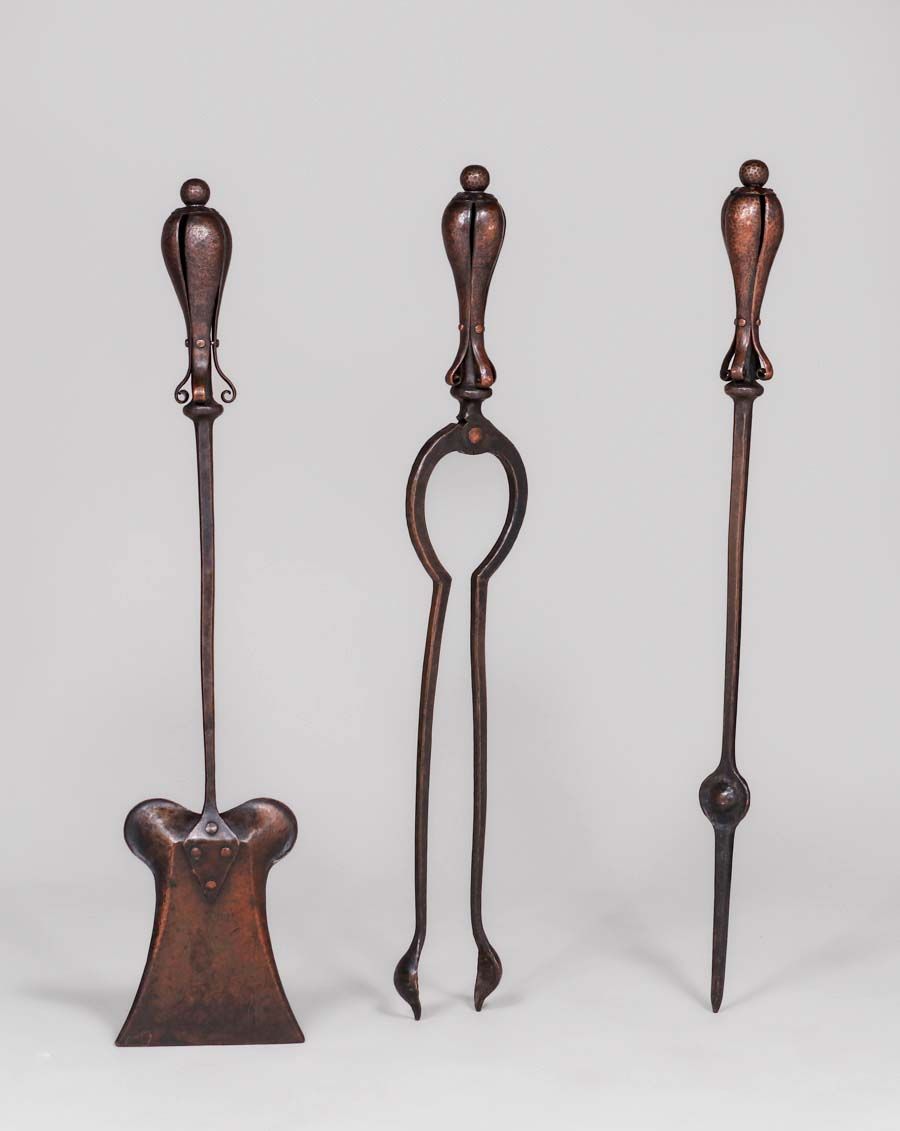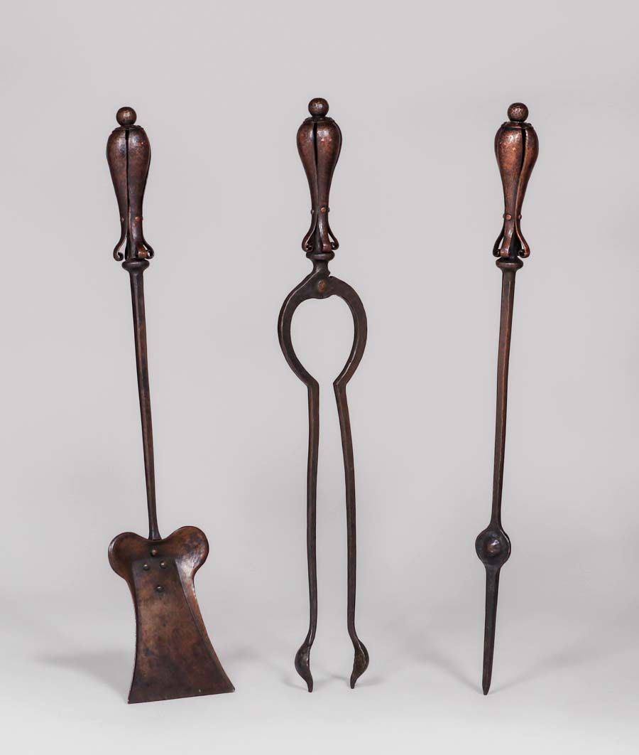 - Gustav Stickley #138 Hammered Copper & Hand-Forged Iron Fireplace Tools c1905