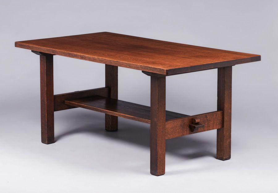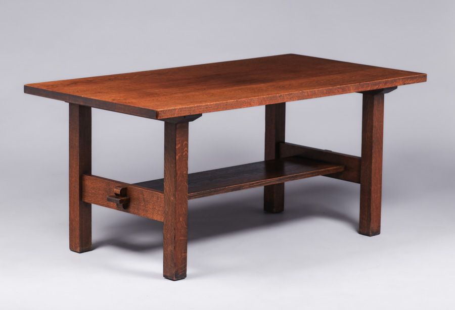 Gustav Stickley #623 Rectangular Table c1910. Signed. Although promoted heavily in Gustav Stickley's Craftsman magazine, this form rarely surfaces. It is even more rare to find this form in such excellent original finish. 66" x 35.5"w x 30"h SOLD