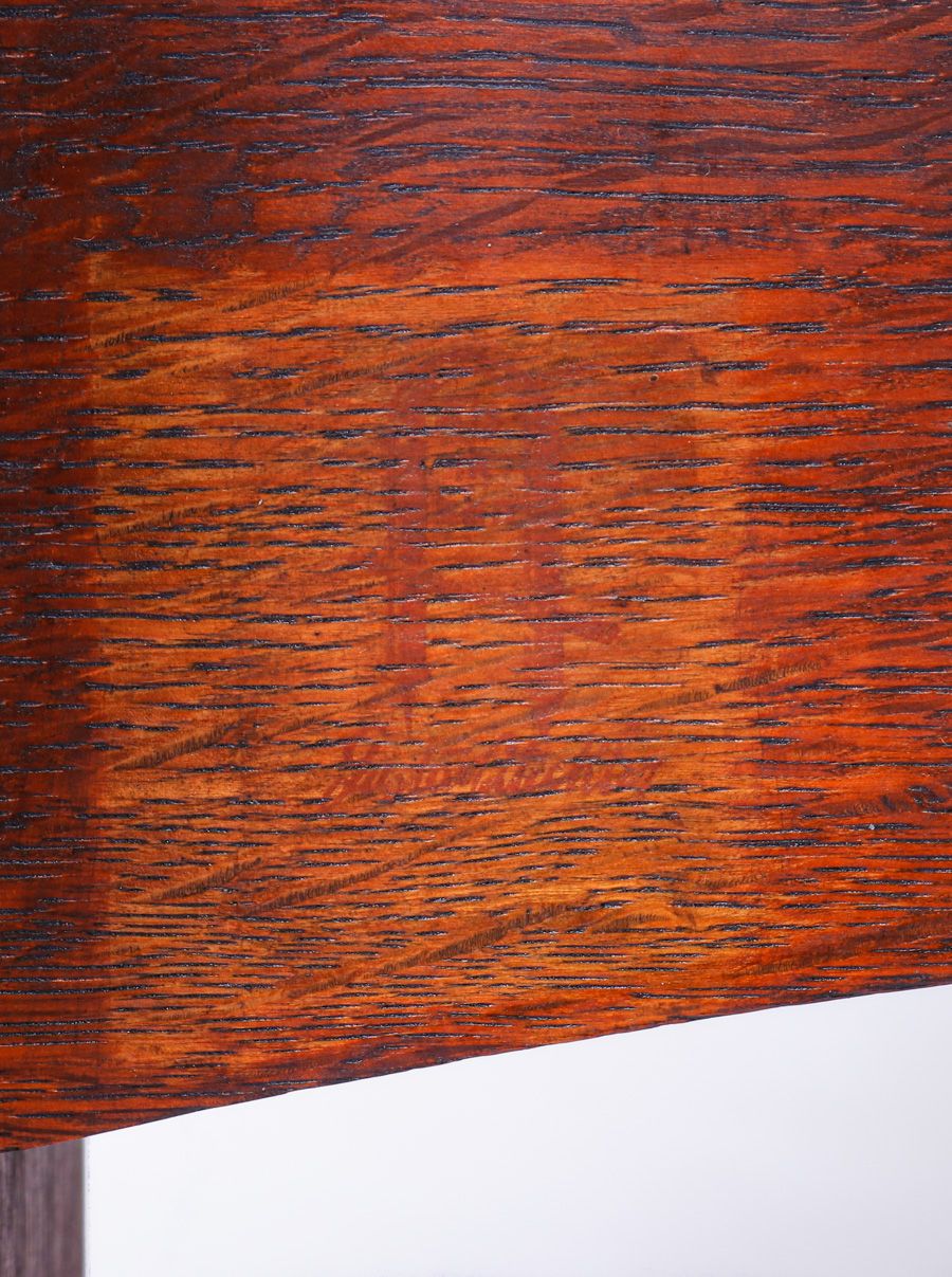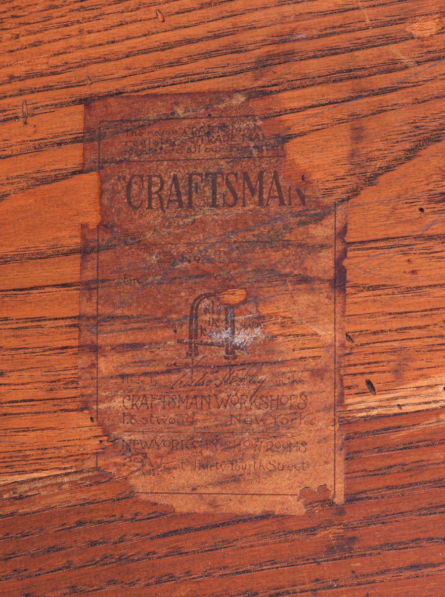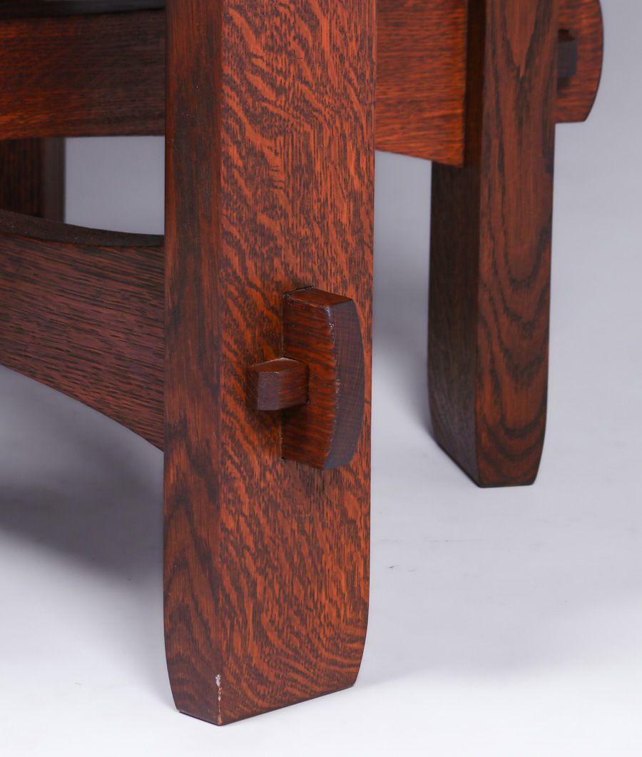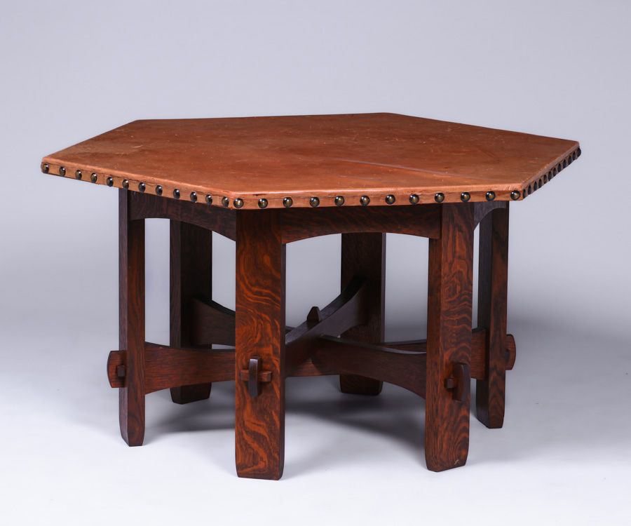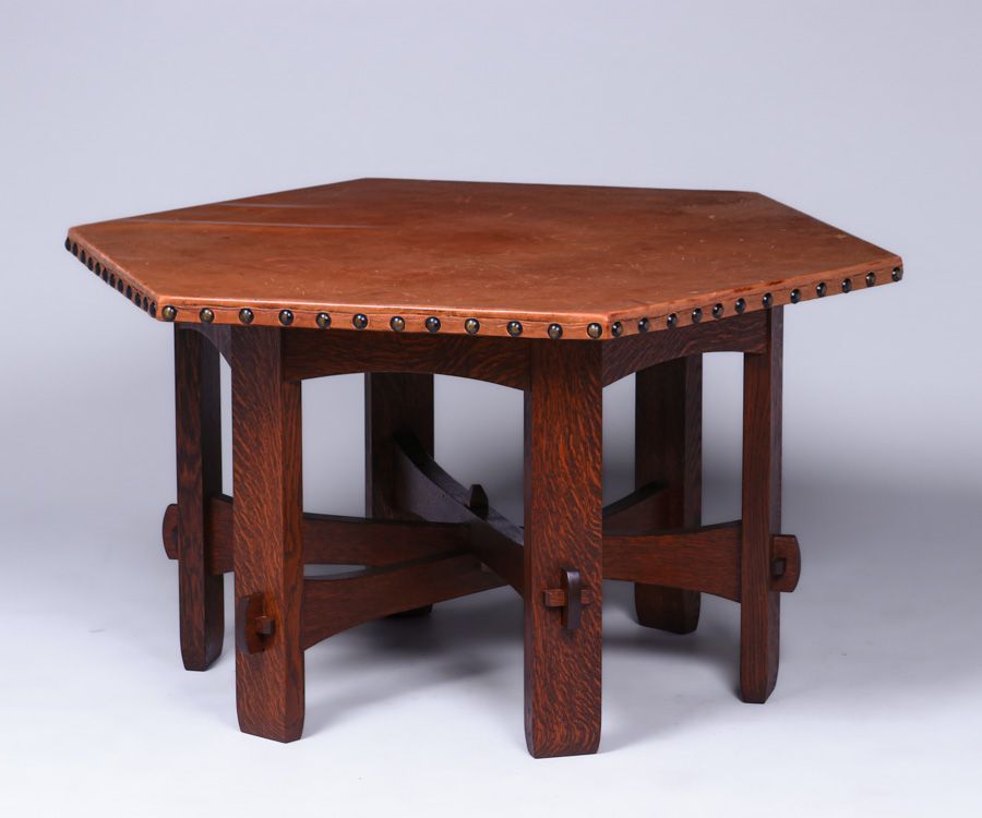 Gustav Stickley #625 Hexagonal Table c1905. Signed. Color added to original finish. Very nicely replaced leather on top. Rock solid sturdy. 48″ x 48″ x 29.25″h SOLD