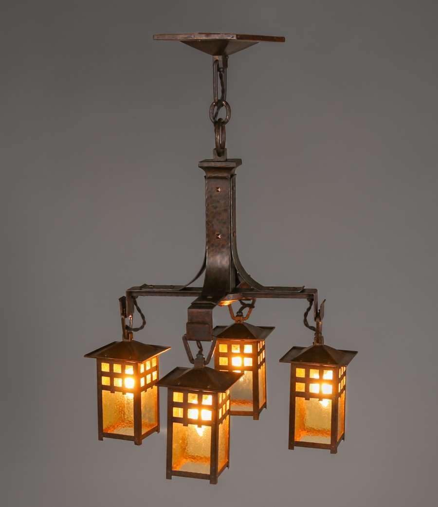 Gustav Stickley #730 Hammered Copper Chandelier c1910. Signed. Excellent original patina and original amber glass. 34.75"h x 22" x 22" SOLD