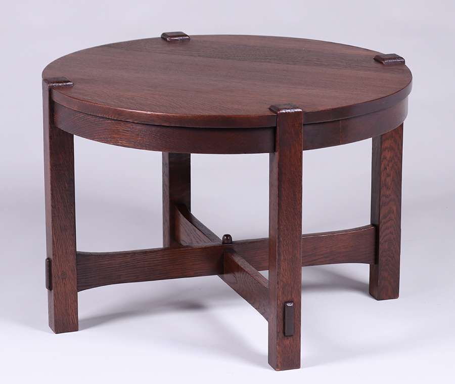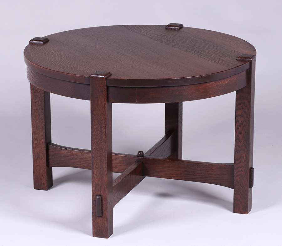 Gustav Stickley #436 lamp table converted to a coffee table. (We would never cutdown such an important Gustav Stickley table but we salvaged and restored it.) Signed with 1902 Stickley signature in box. Very nicely refinished. 26"d x 18"h SOLD