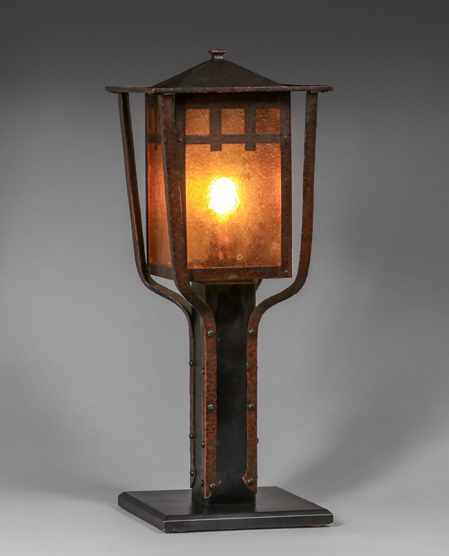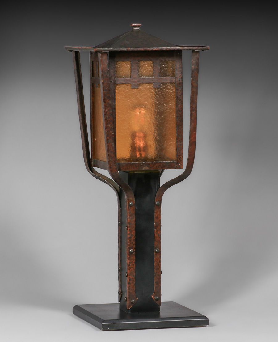- Gustav Stickley Hammered Copper & Amber Glass Newell Post Lamp c1910