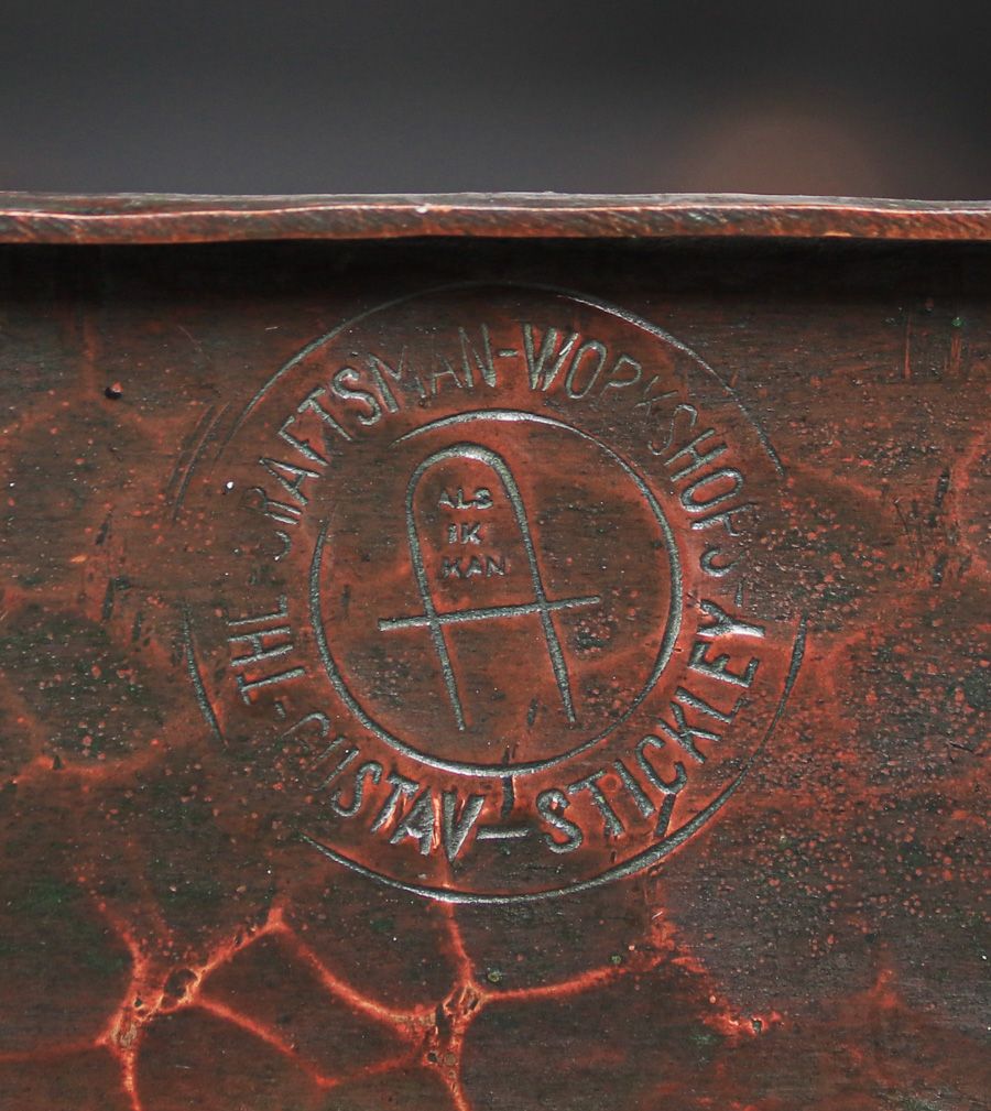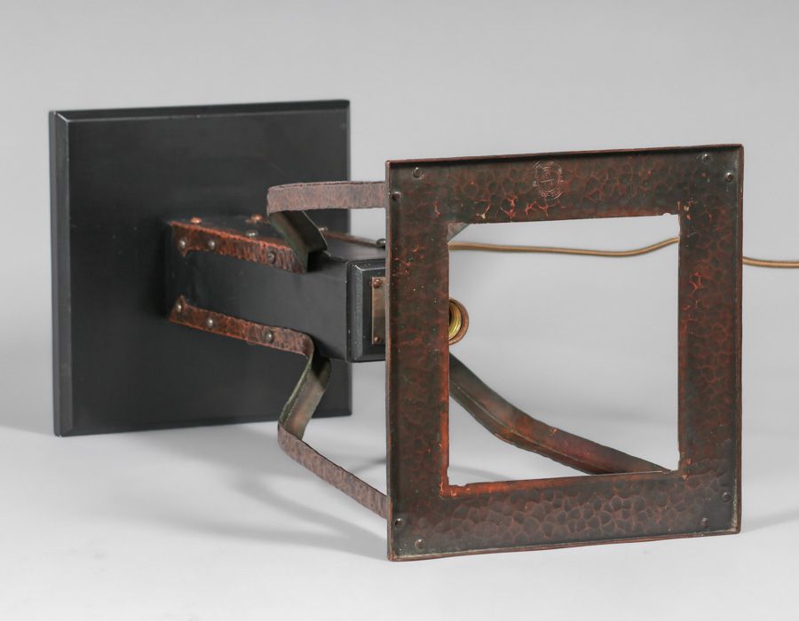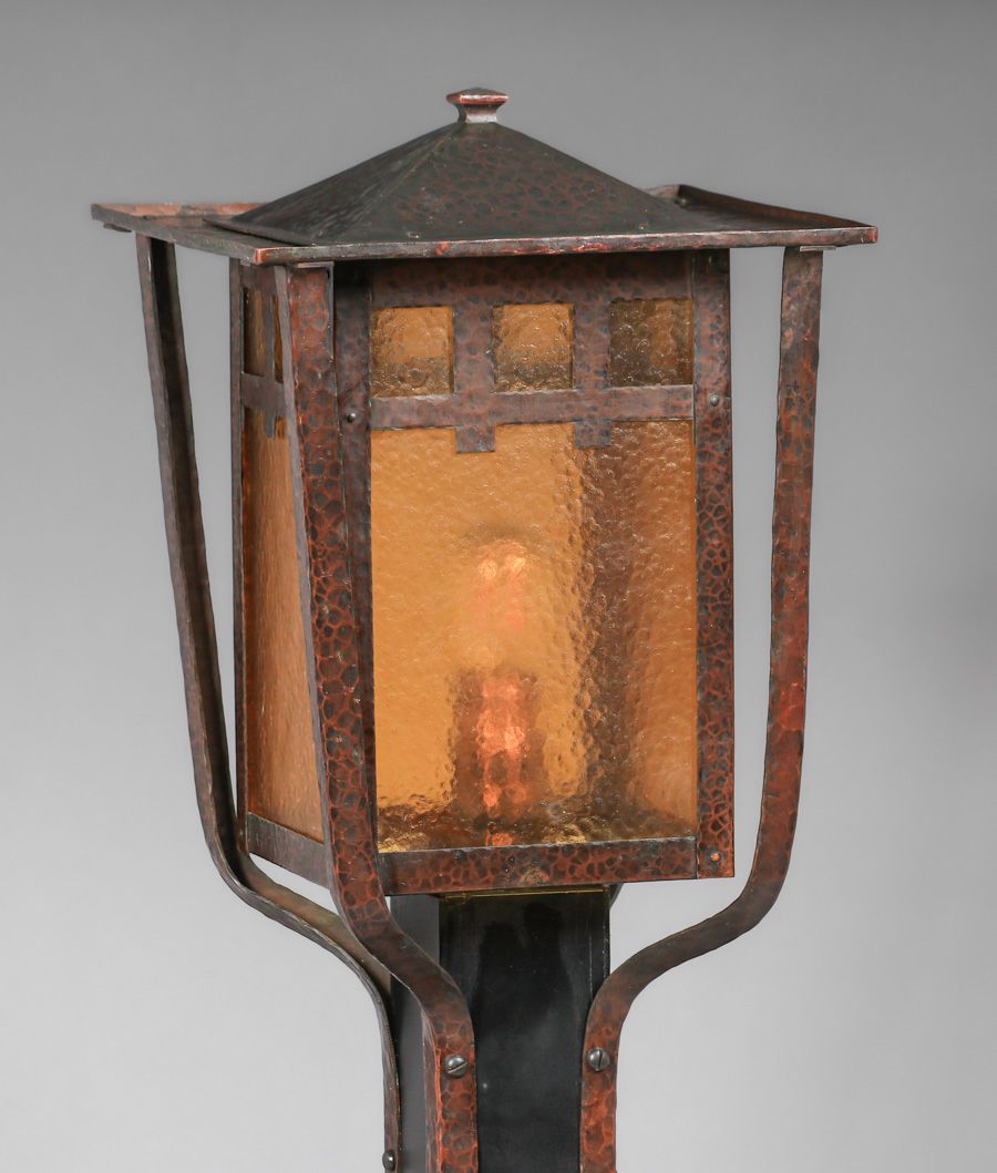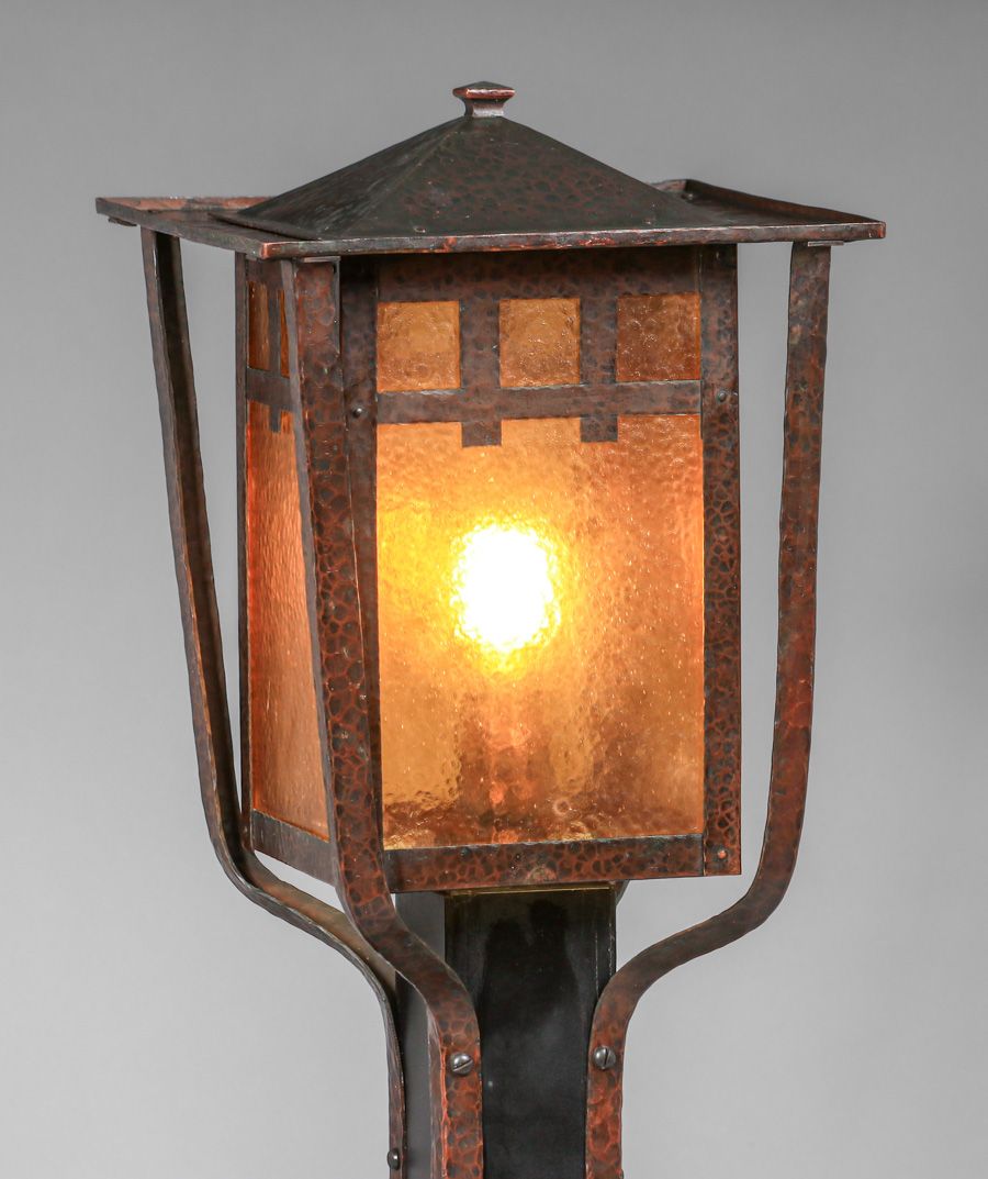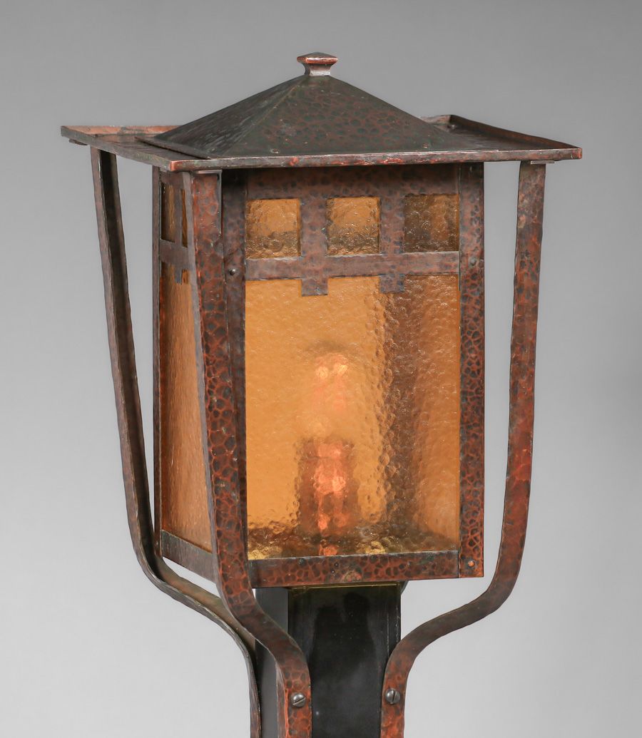 Gustav Stickley Hammered Copper & Amber Glass Newell Post Lamp c1910. Signed. Excellent original patina. Original amber glass in perfect condition. 24.75″h x 9.5″ x 9.5″ $12,000