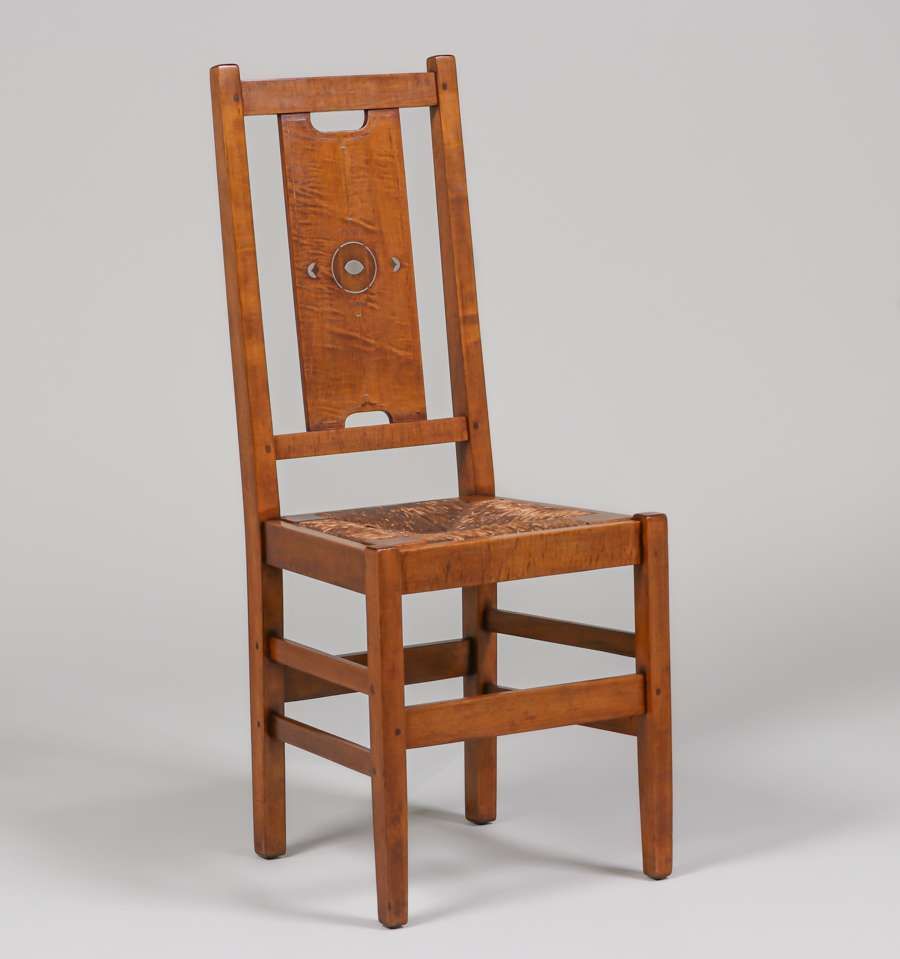 Gustav Stickley - Harvey Ellis Inlaid Maple Side Chair c1912. Although Ellis died in 1904, this chair shows his phenomenal influence. Unsigned. Color added to original finish. Very sturdy. Original rush seat. 40.25"h x 14"w x 15.75"d SOLD
