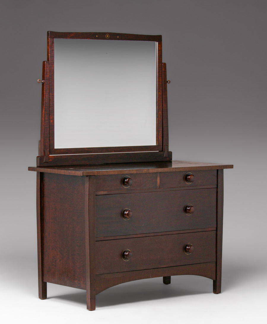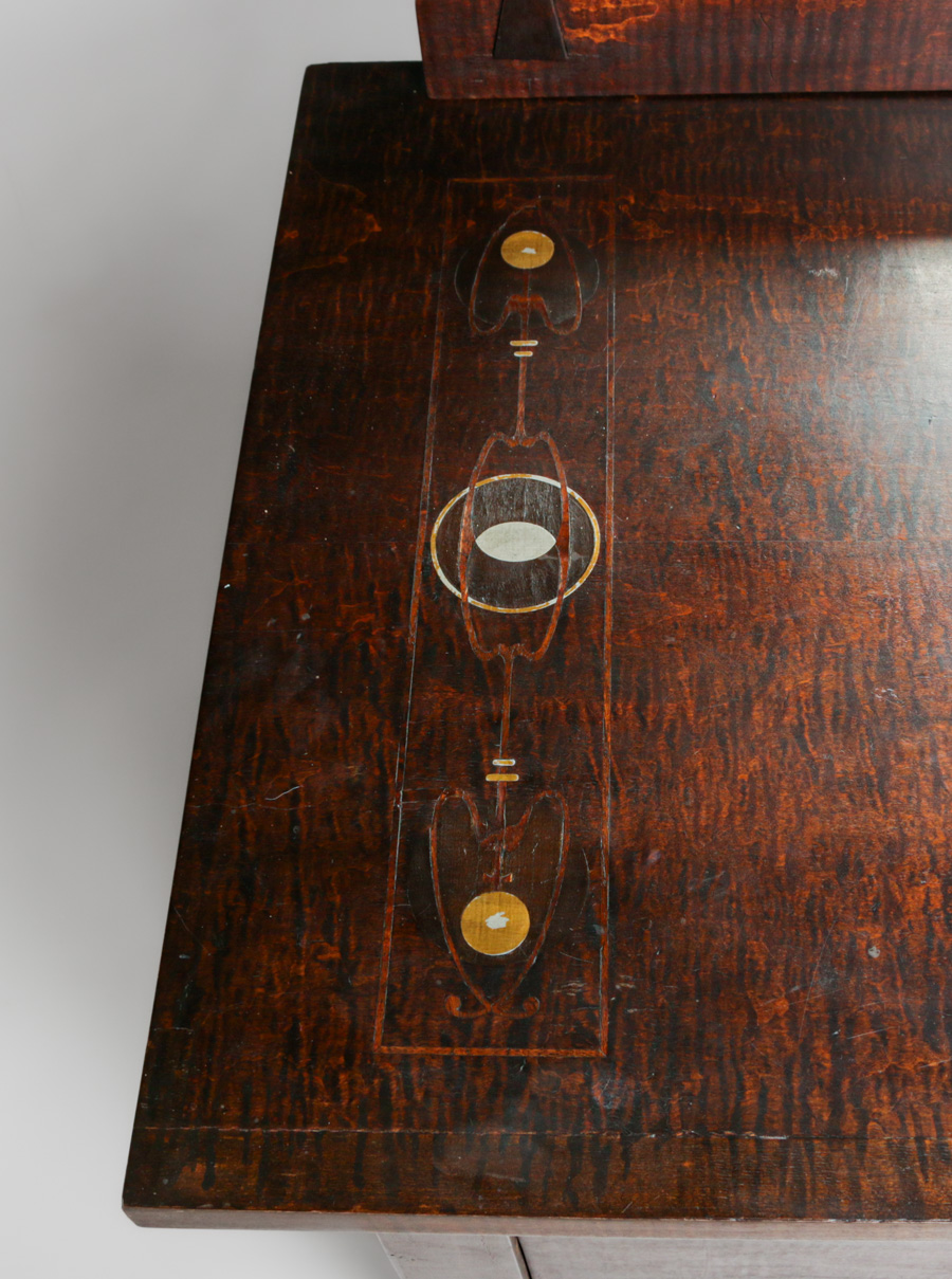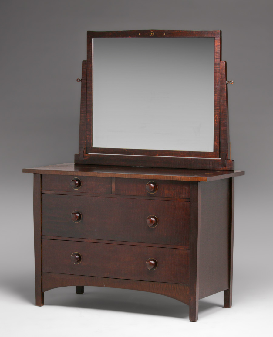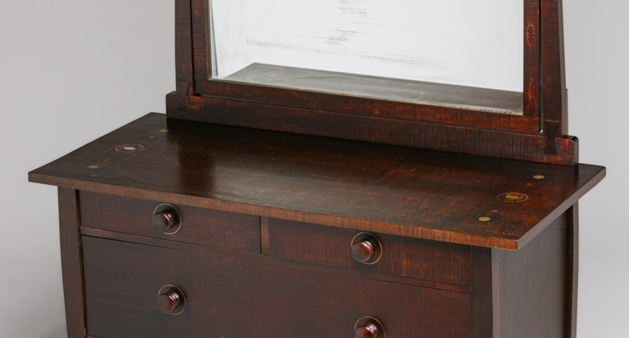 21714. Gustav Stickley – Harvey Ellis Maple Inlaid Dresser with Mirror c1904.  Signed.  Color added to original finish.  Nearly invisible professional conservation to areas of veneer and inlay.   66.5″h (32″h to top surface) x 48.25″w x 22″d $12,000