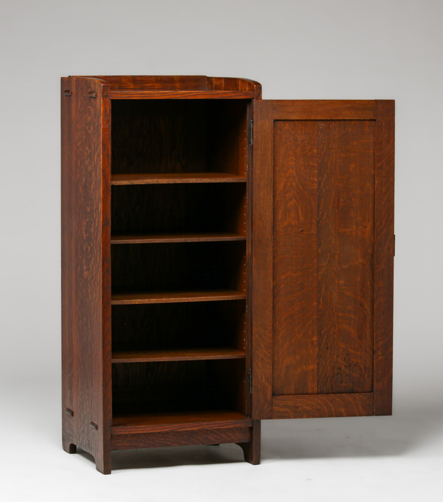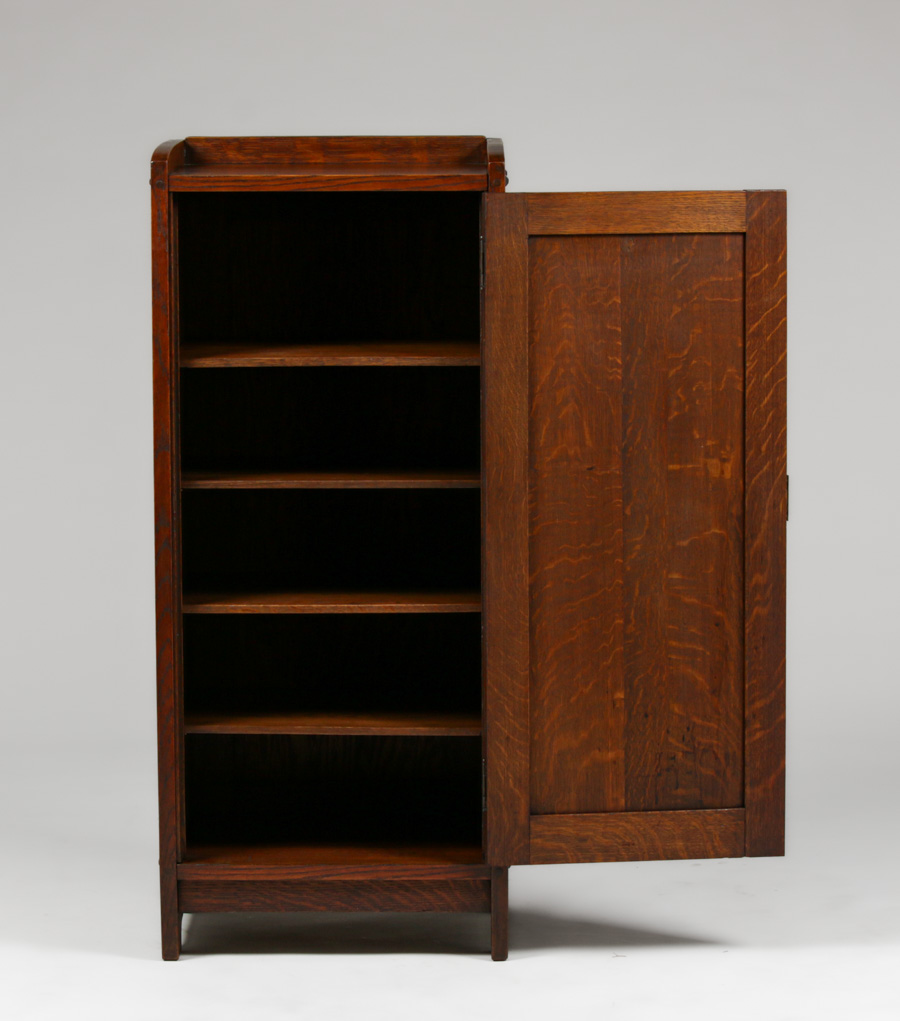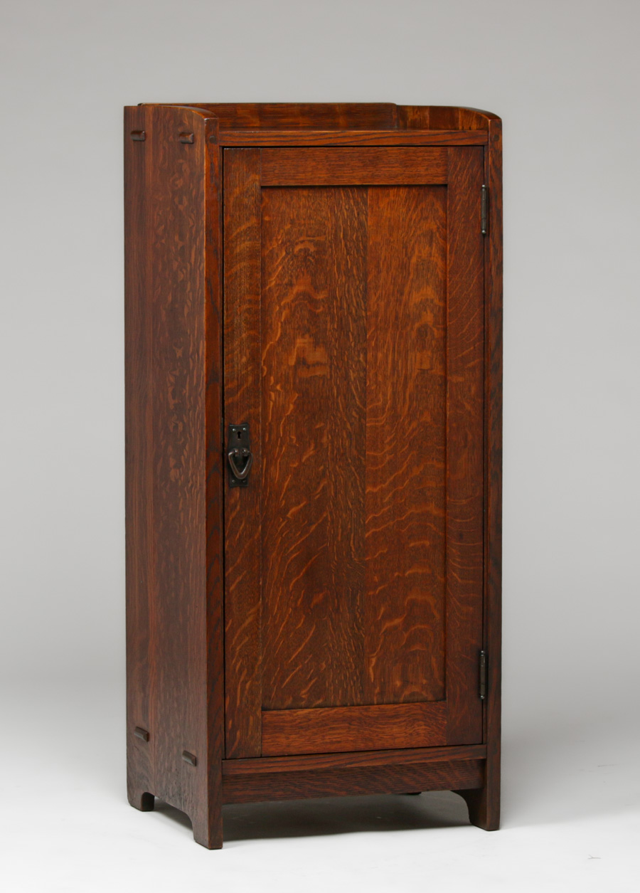 21760. Gustav Stickley One-Door Music Cabinet c1910. Signed. Some light stains to top. Excellent original finish. 47″h x 20″w x 17″d $9500