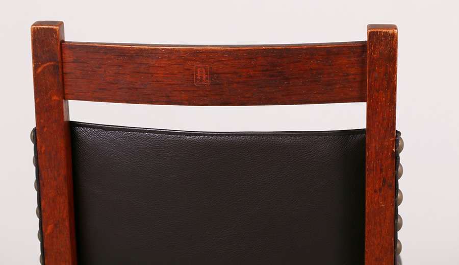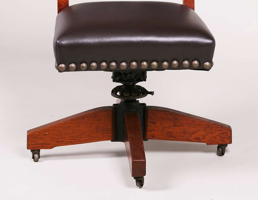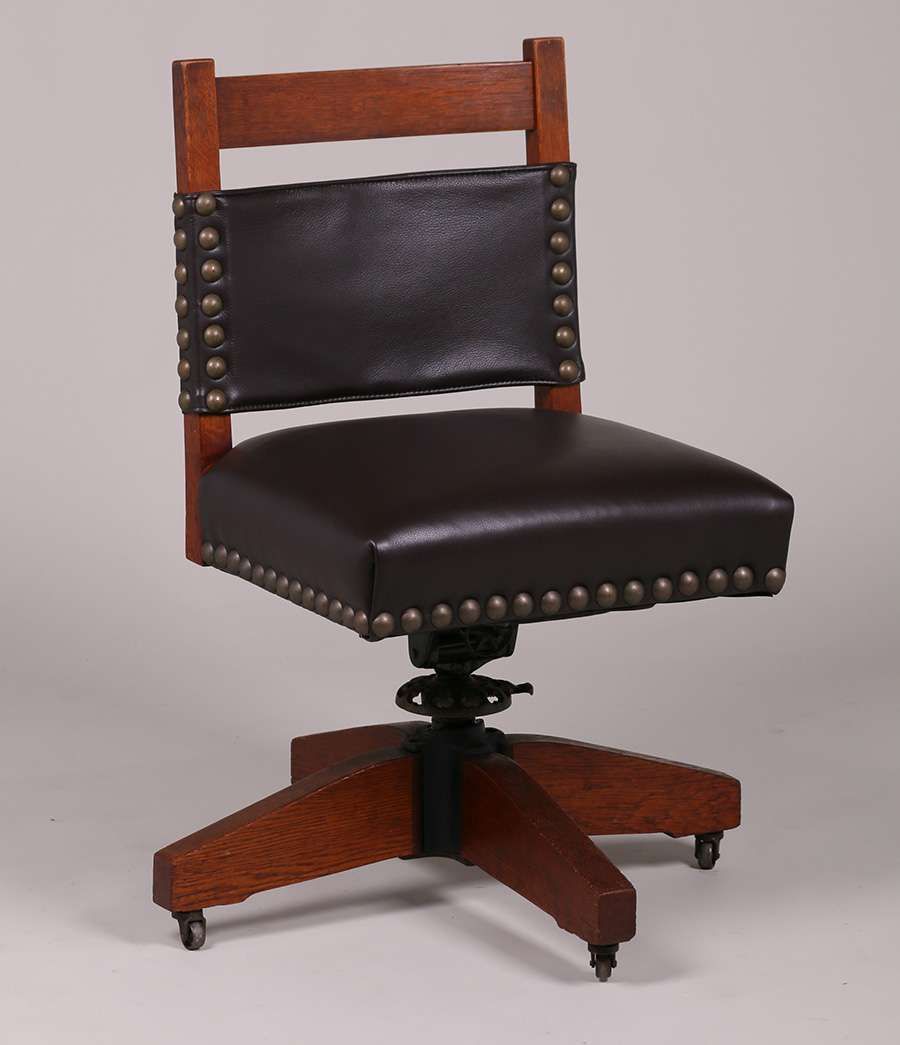 Gustav Stickley swivel chair c1902-1904. Signed with early red decal in box at the top back of the backrest. Excellent original finish. 33.5″h x 19"w x 18"d SOLD