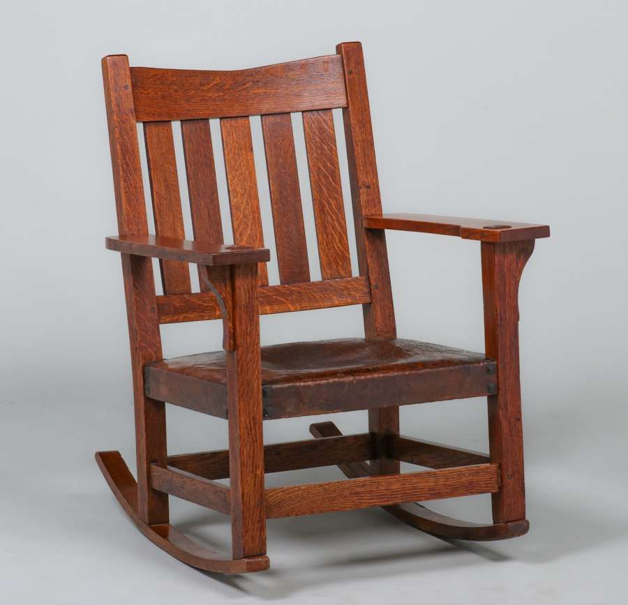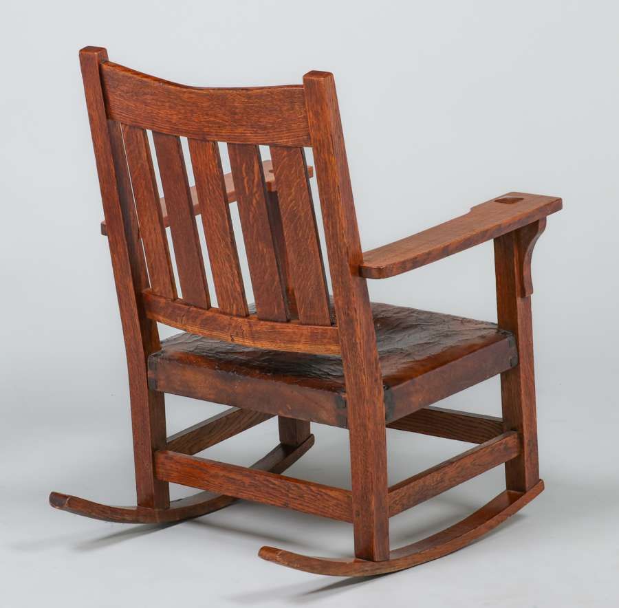 Gustav Stickley V-Back Rocker c1910. Signed. Excellent original finish and original leather. This is one of the nicest Gustav Stickley V-back rockers we have ever seen. 33.5 'h x 25.5"w x 20.5"d SOLD