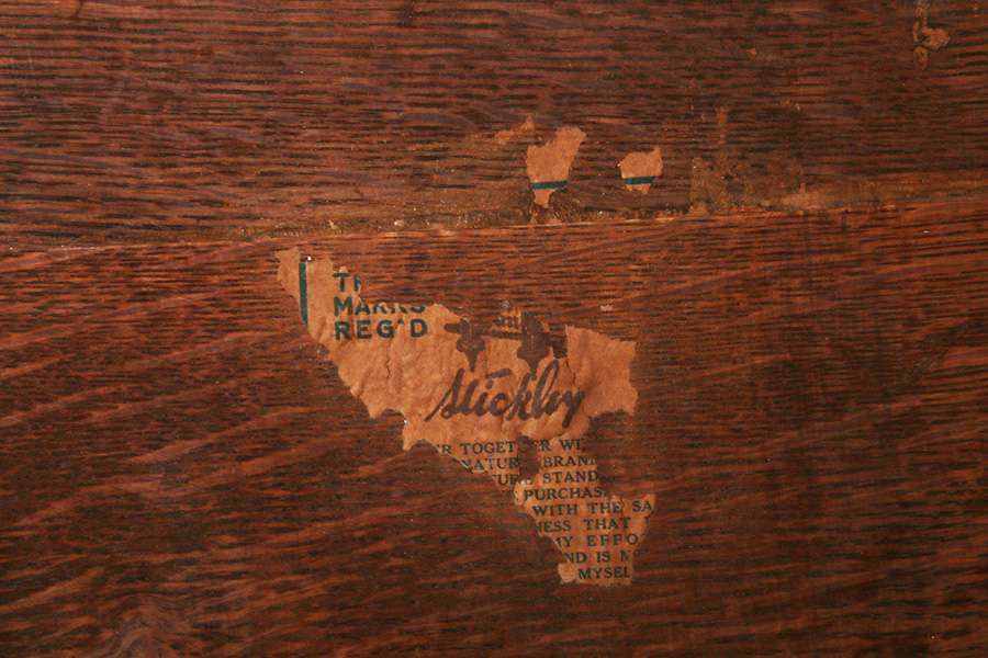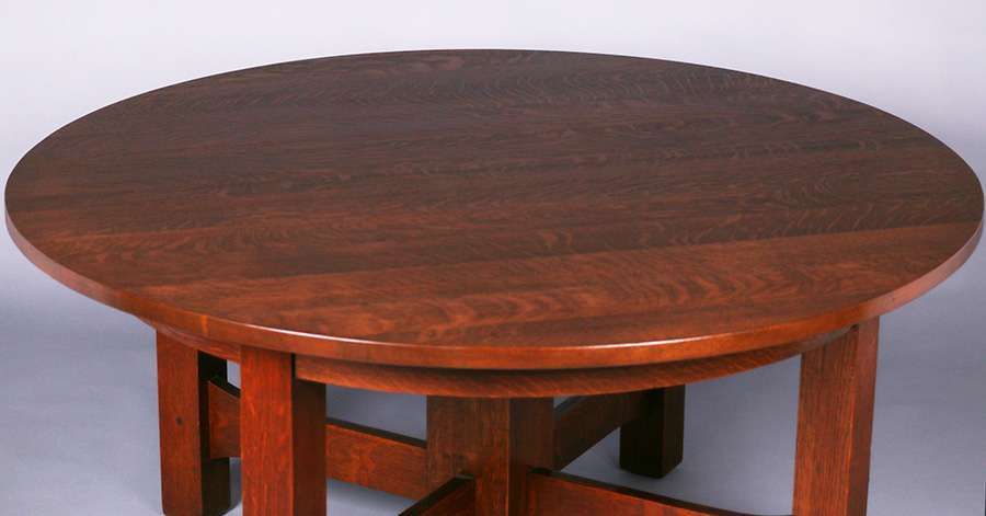 Large Gustav Stickley 60"d five-leg cross-stretcher dining table with fixed-top. Original finish to base. Top very nicely refinished. Signed with partial paper label under top. 60"d x 29"h SOLD
