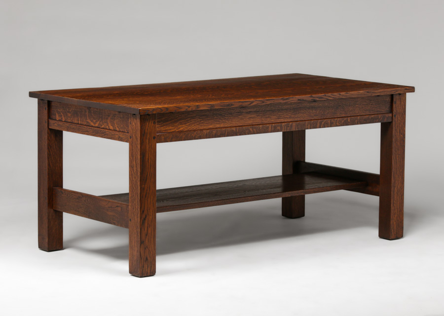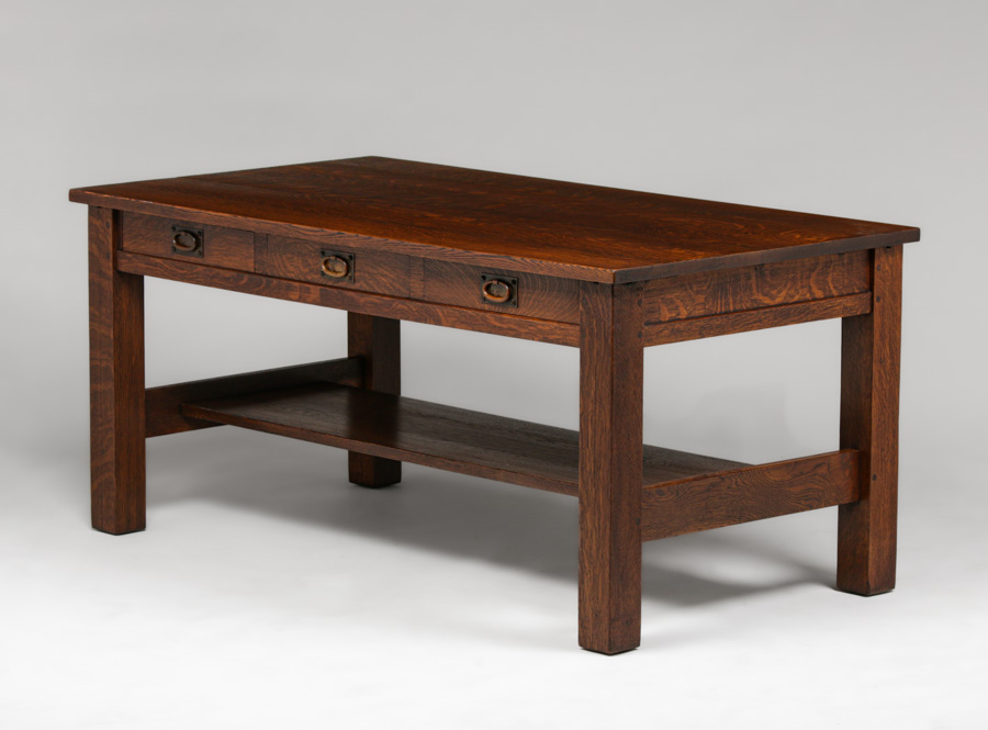 21611. Large Gustav Stickley Three-Drawer Library Table c1910. Signed. Top refinished perfectly to match excellent original finish. 66″w x 35.75″d x 30″h $6500