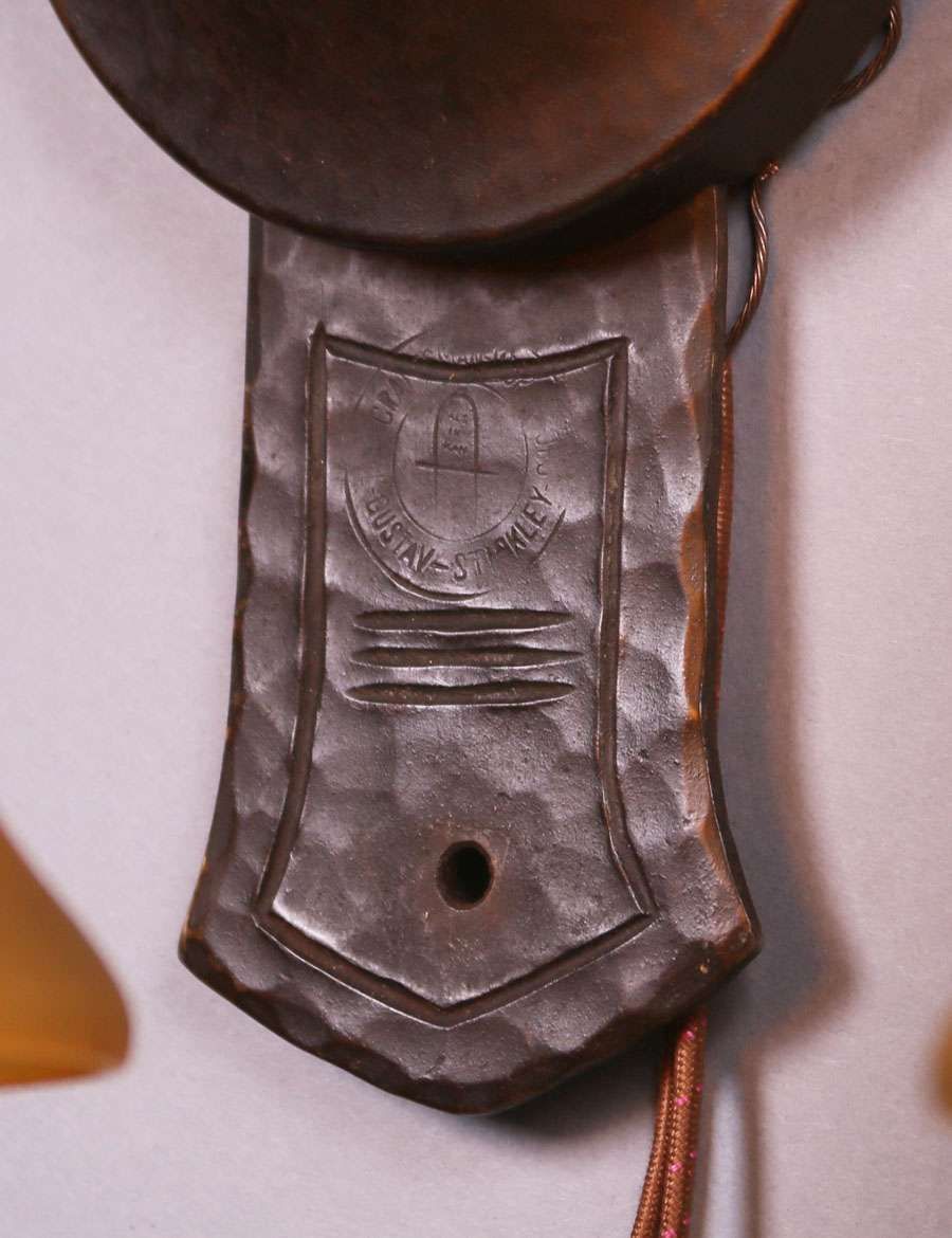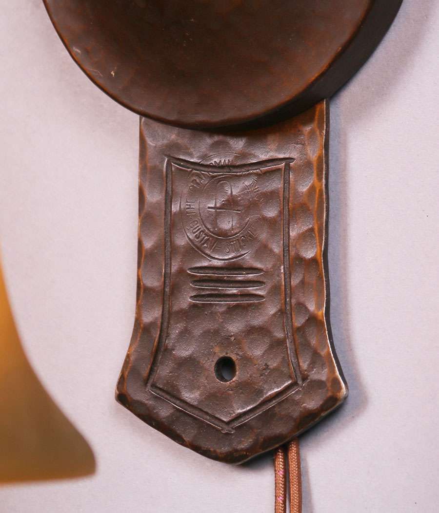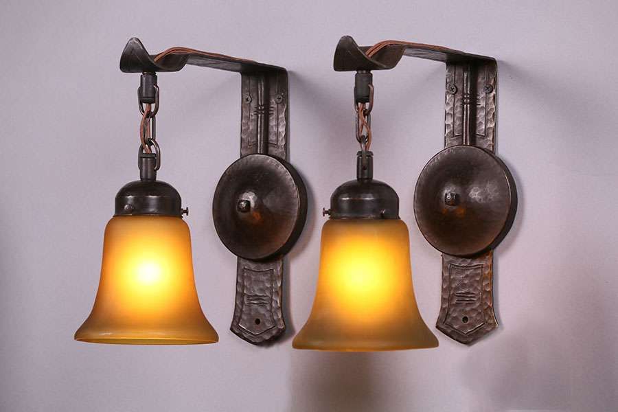 Pair of Gustav Stickley hammered copper sconces with original glass shades. Signed. Original patina. 10.5"h x 5"d shade x 9.5" depth from wall SOLD