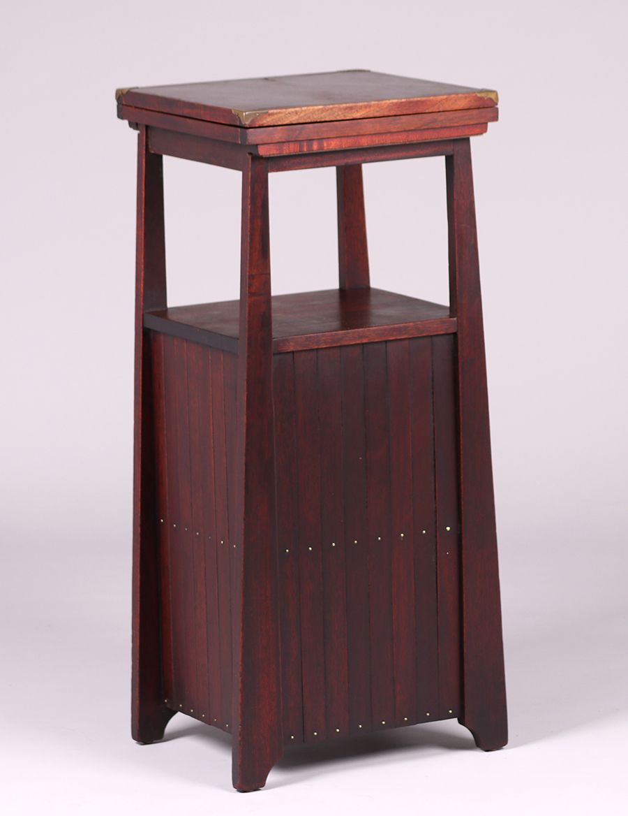 Lakeside Crafts Shop mahogany cellarette with copper-lined flip top and cutout strap-hinges. Original finish. Signed. 32.35"h x 13.75"sq (flipped open 27.5"w x 13.75") SOLD