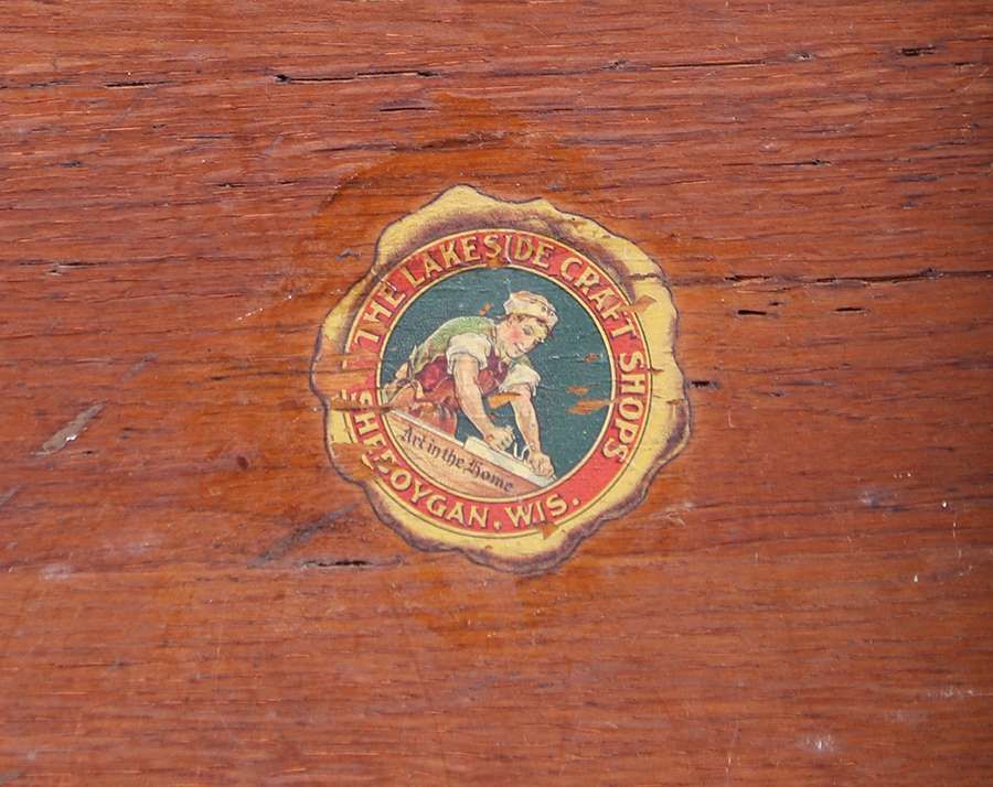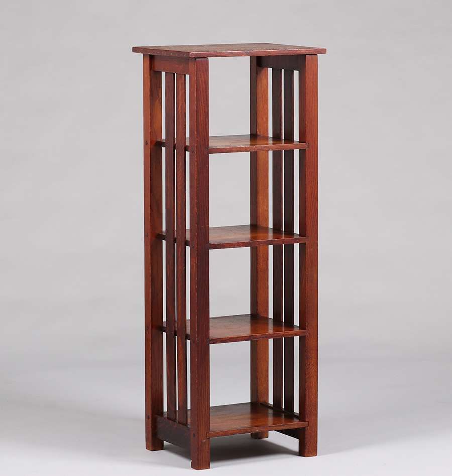 Lakeside Crafts Shop - Sheboygan, WI tall magazine stand bookshelf c1910. Signed. Top refinished to match original finish base. 43.25"h x 16"w x 13" SOLD