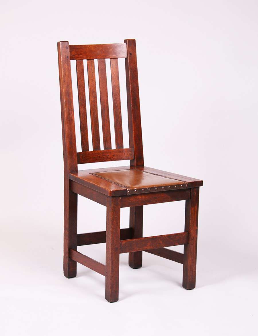 5 Limbert Dining Chairs each with four vertical slats. Excellent original finish. Signed. 3 with original leatherette upholstery and two redone to be similar. 39"h x 17.25"w x 17"d SOLD