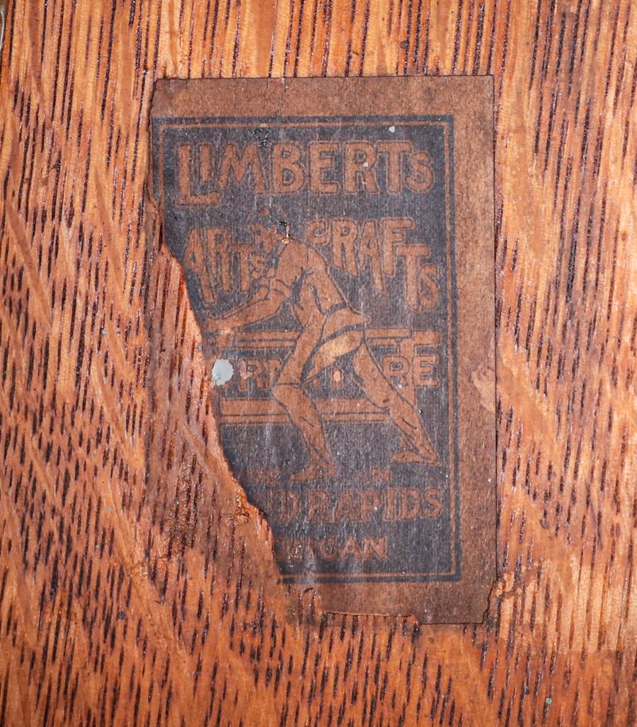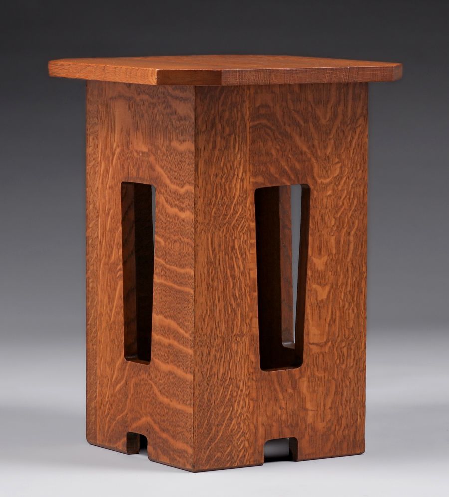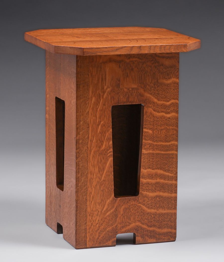 Early Limbert Cutout Taboret c1902-1904. Signed with early paper label before they expanded to Holland, Michigan. Excellent original finish. 20h x 15 x 15 inches SOLD