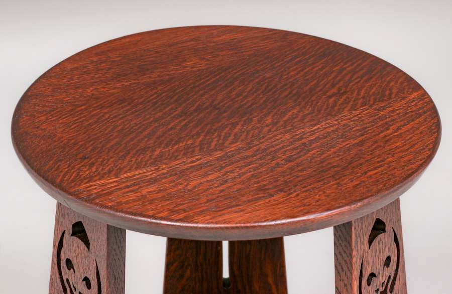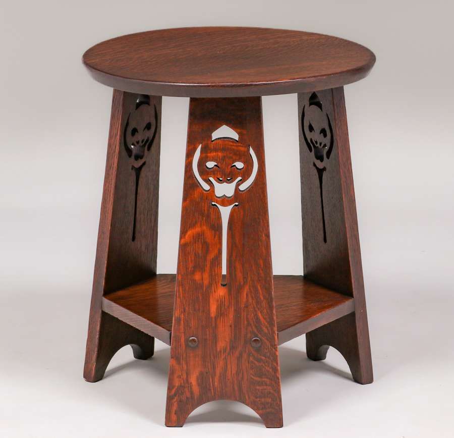 Early Limbert Jack-O-Lantern Cutout Taboret c1905. Signed with paper label. Very nicely refinished. One of the rarest forms of early Limbert taborets. 18"h x 15"d SOLD