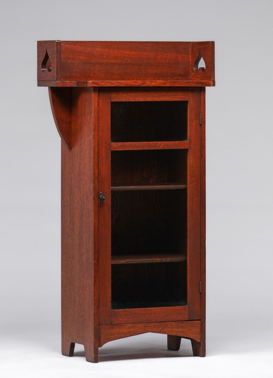 Early Limbert Spade Cutout One-Door Bookcase c1902-1905. Signed with paper label. Excellent original finish. 44″h x 24″w x 13″d $7500