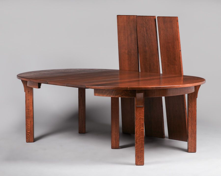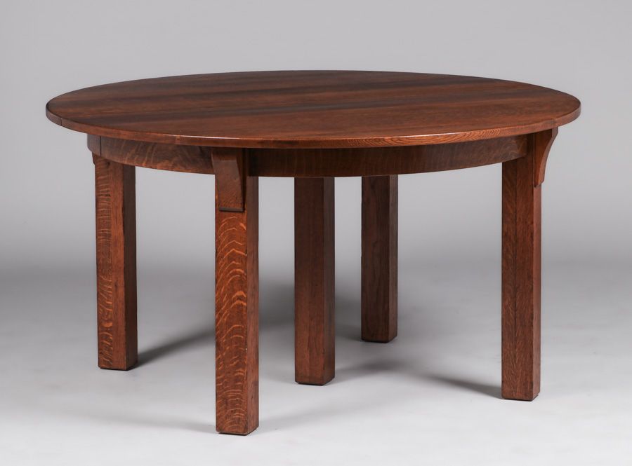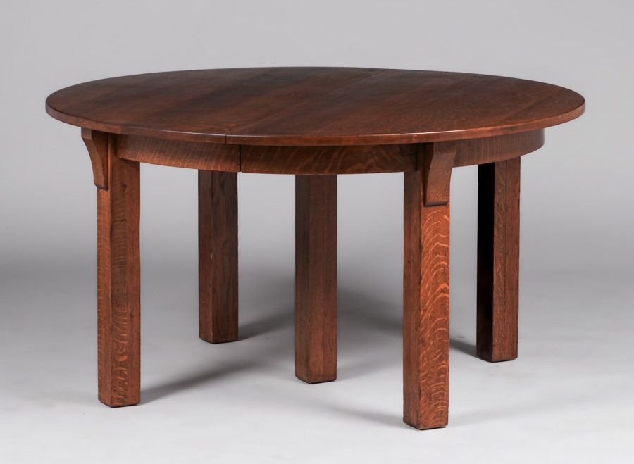 Limbert 54"d Five-Leg Dining Table c1910. Six original 11"w leaves. Unsigned. Very nice old refinish. 54"d x 29.25"h (extends to 120" x 54" with leaves) $7500