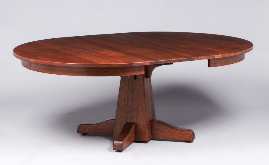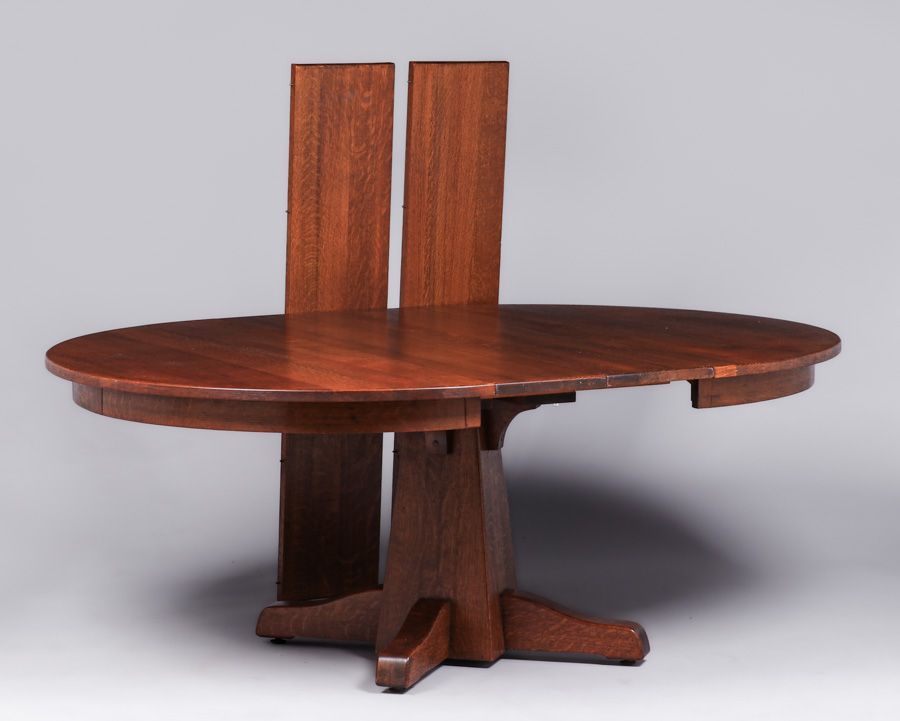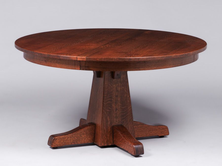 Limbert 54"d Pedestal Dining Table c1910. Signed with branded mark. Four original 11"w leaves. Excellent original finish. 54"d x 29"h (extends to 98" x 54") SOLD