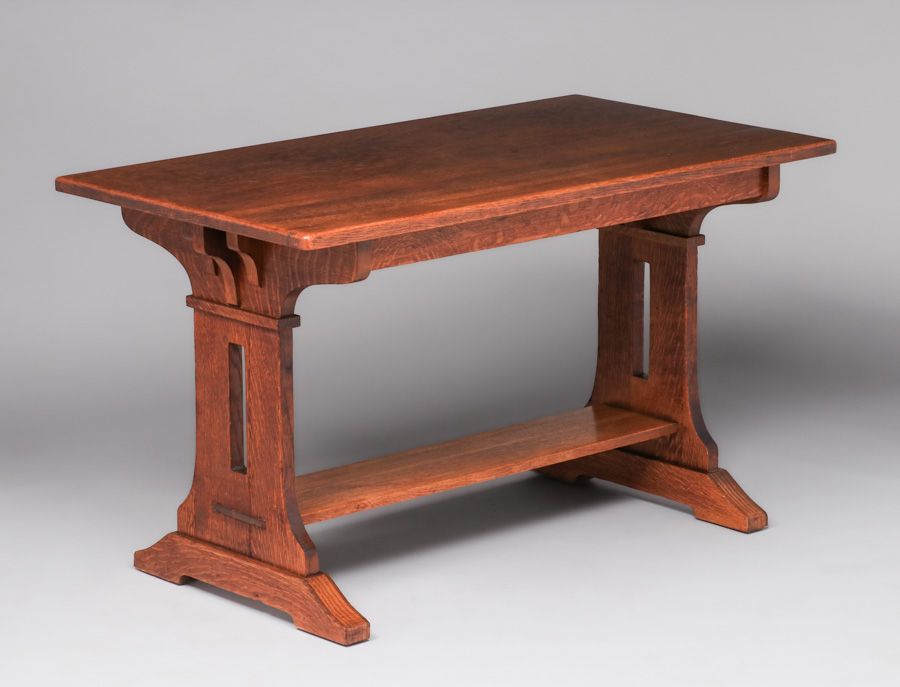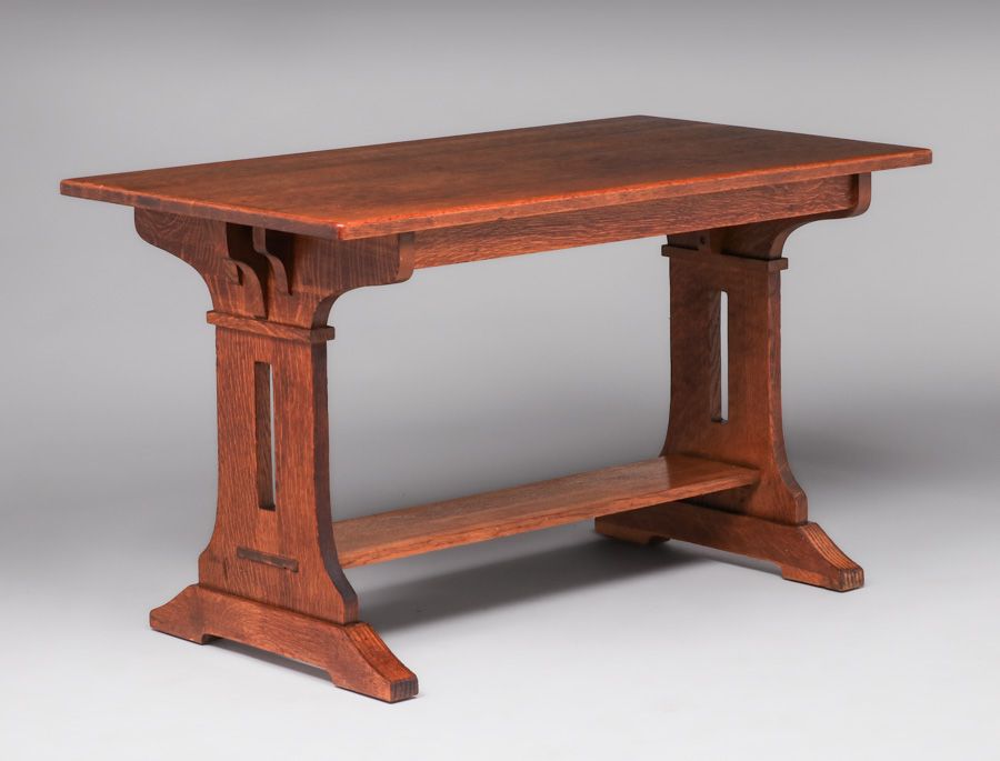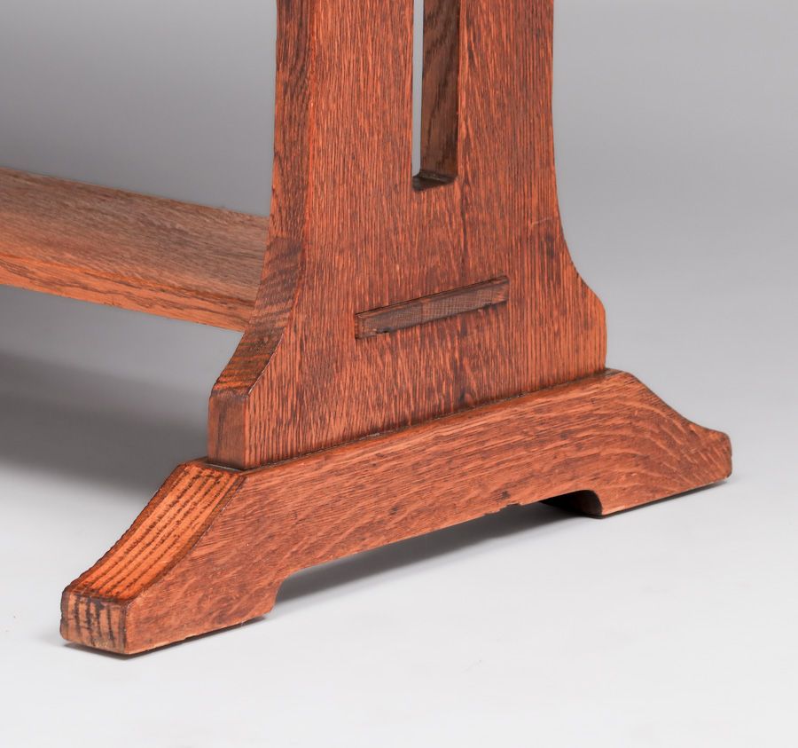 Limbert Cutout Prairie School Trestle Table c1910. Signed with branded mark. Excellent original finish. Rock solid sturdy. 50"w x 28"d x 29"h SOLD