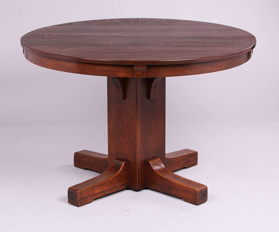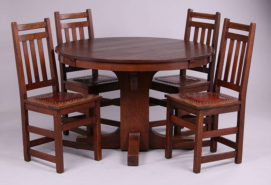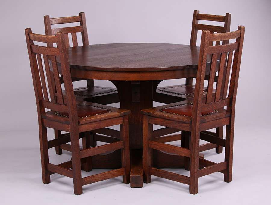 Limbert 45"d Dining Table with 6 Matching Limbert Chairs. 5 side chairs and 1 armchair. Two 11" leaves. Top surface refinished. Base of tabs and 6 chairs have nice, original finish. Signed with branded mark. Table measures 45"d x 29.5"h (67" x 45" with leaves). SOLD