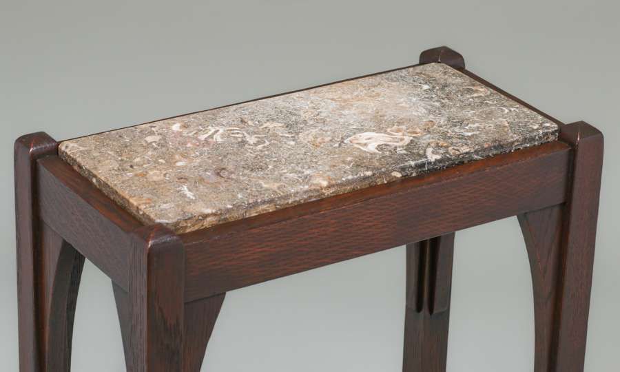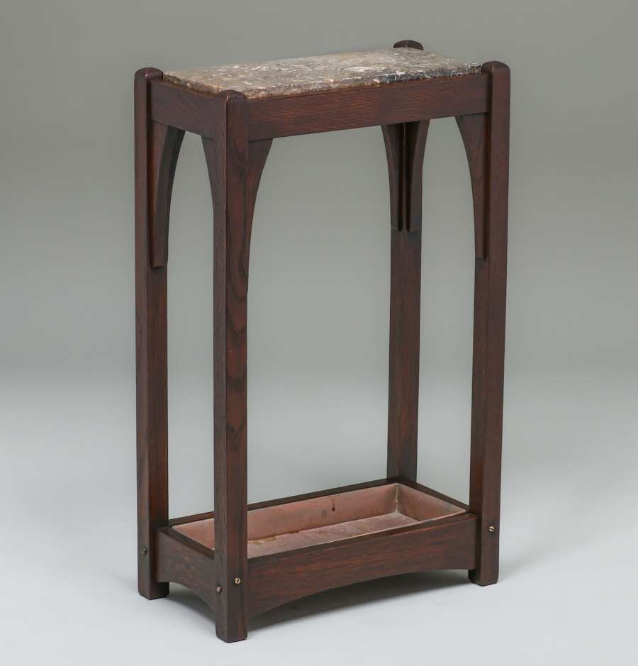 Limbert Oak Umbrella Stand Side Table c1910. Originally an umbrella stand, someone added a piece of marble to make a nice side table. Signed. Very nicely refinished. 28"h x 17"w x 9"d SOLD
